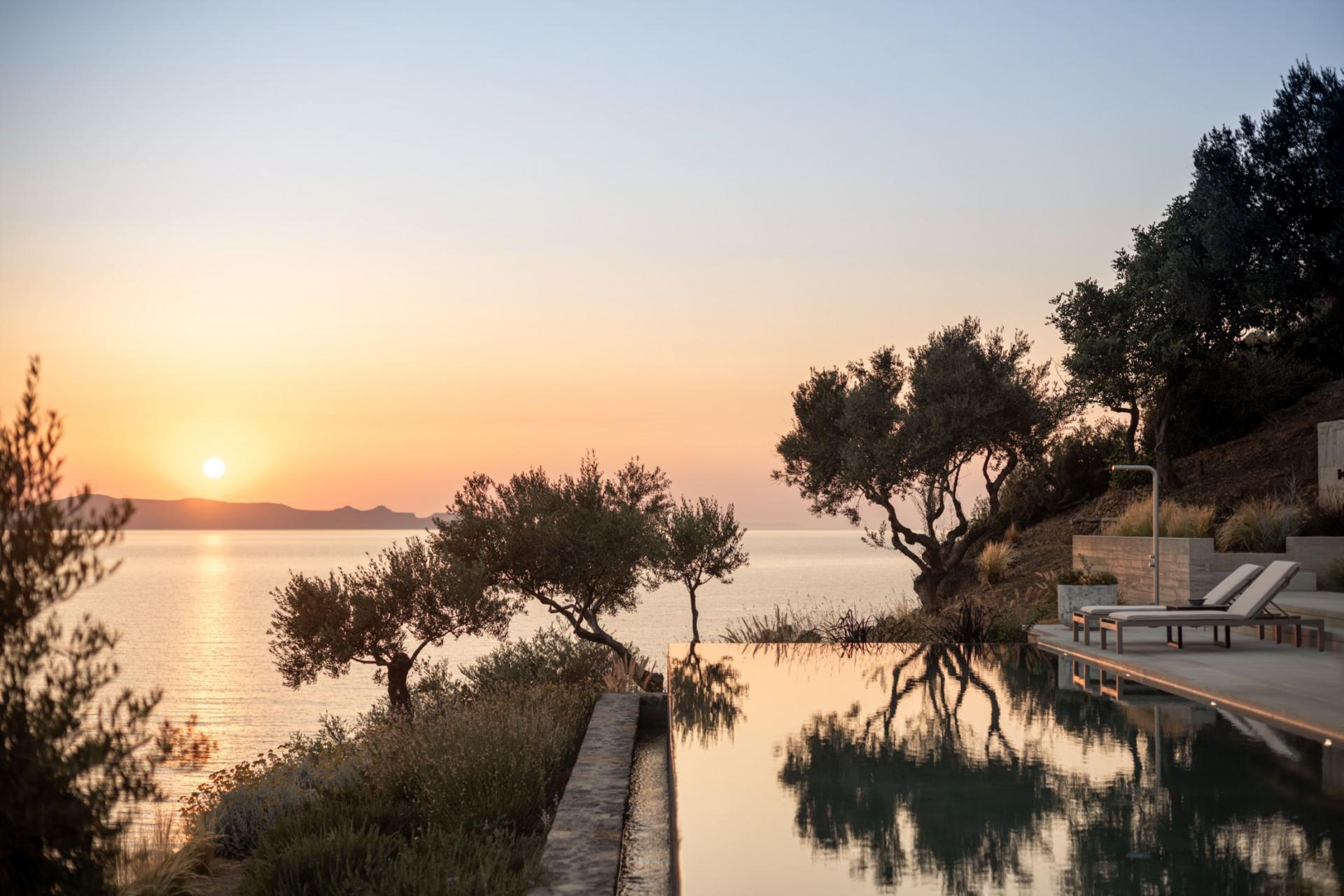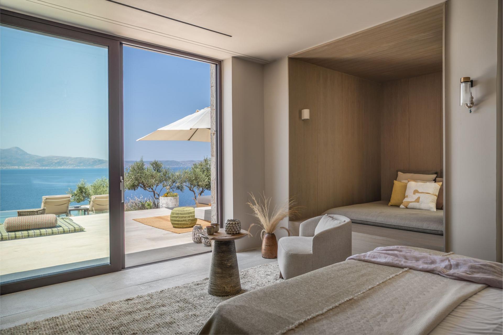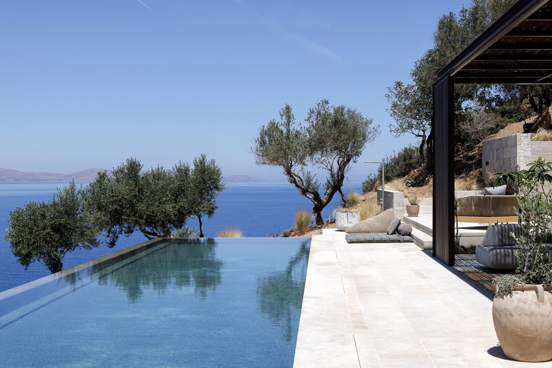 Outside, a sanctum of serenity is paired with striking scenery of the Greek coastline, providing a beautiful backdrop to your Mediterranean retreat. The infinity pool merges with the horizon, isolating guests with nothing but the sheer beauty of nature. Furthermore, a lush Greek garden is embellished with olive trees and native plants, elevating the level of intimacy between guests and nature. The outdoor kitchen and bar create the perfect setting for al fresco dining, whilst a number of luxury lounge areas, some sheltered from the sun, also allow for guests to unwind as they please with a gorgeous panoramic view to pair.