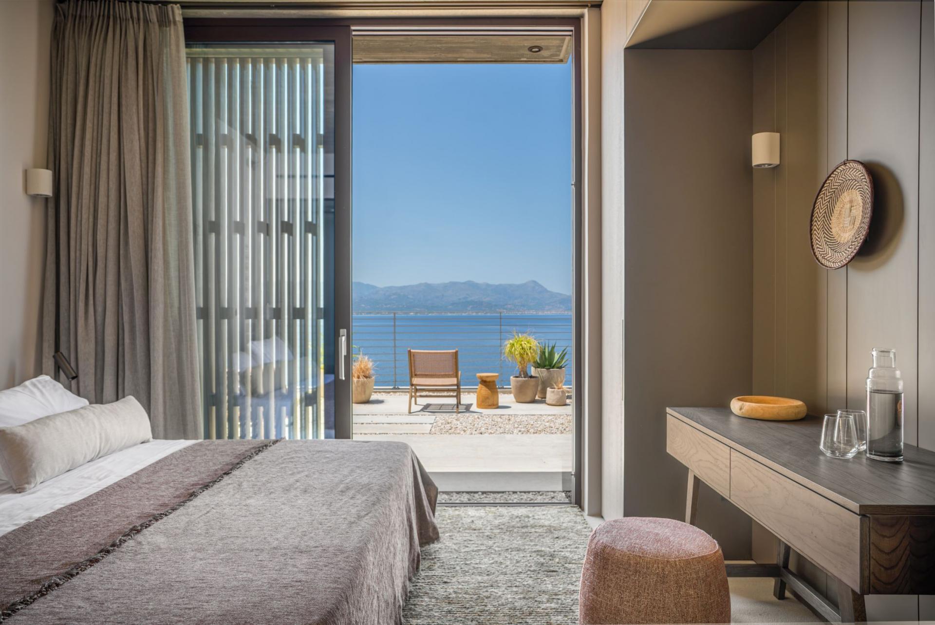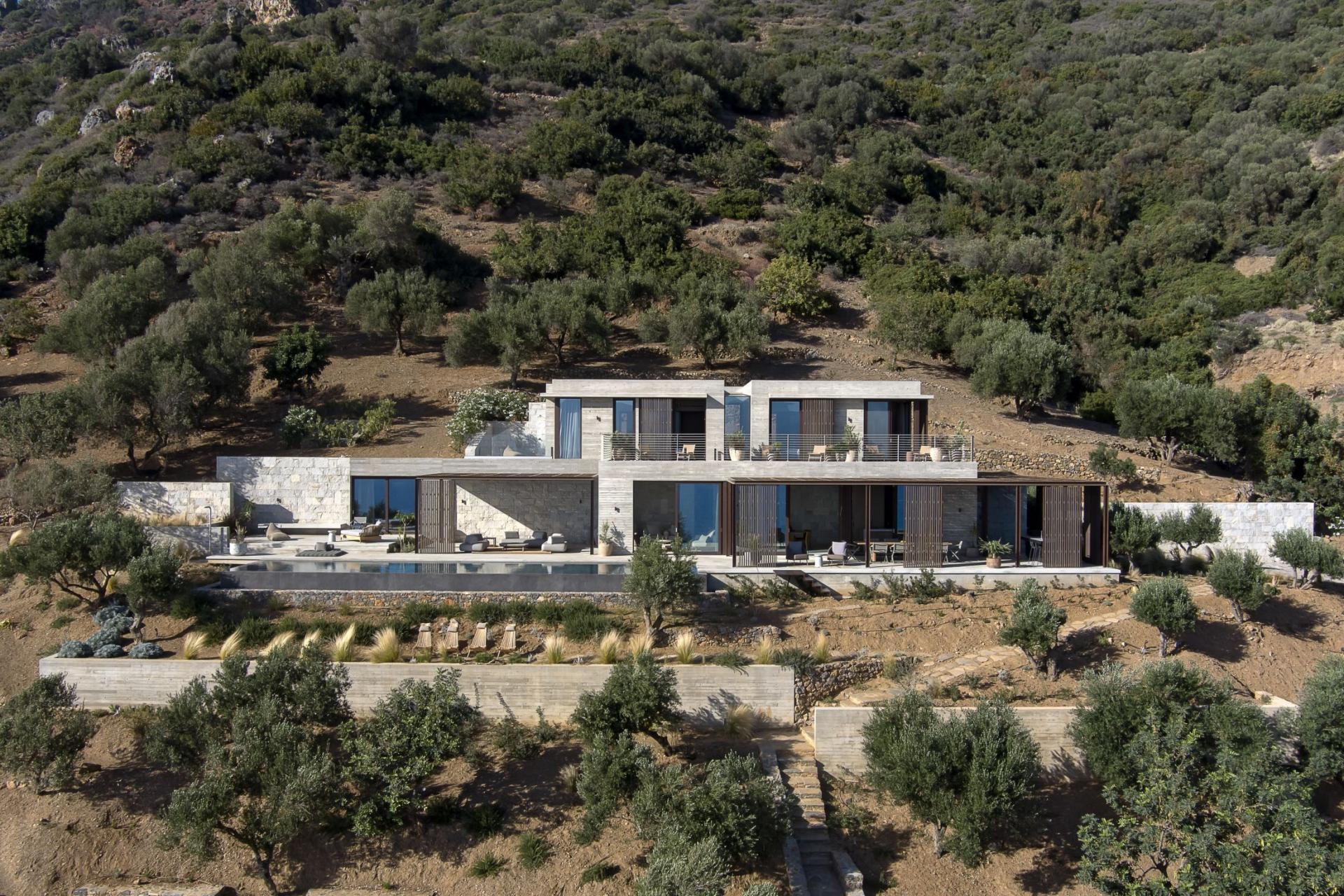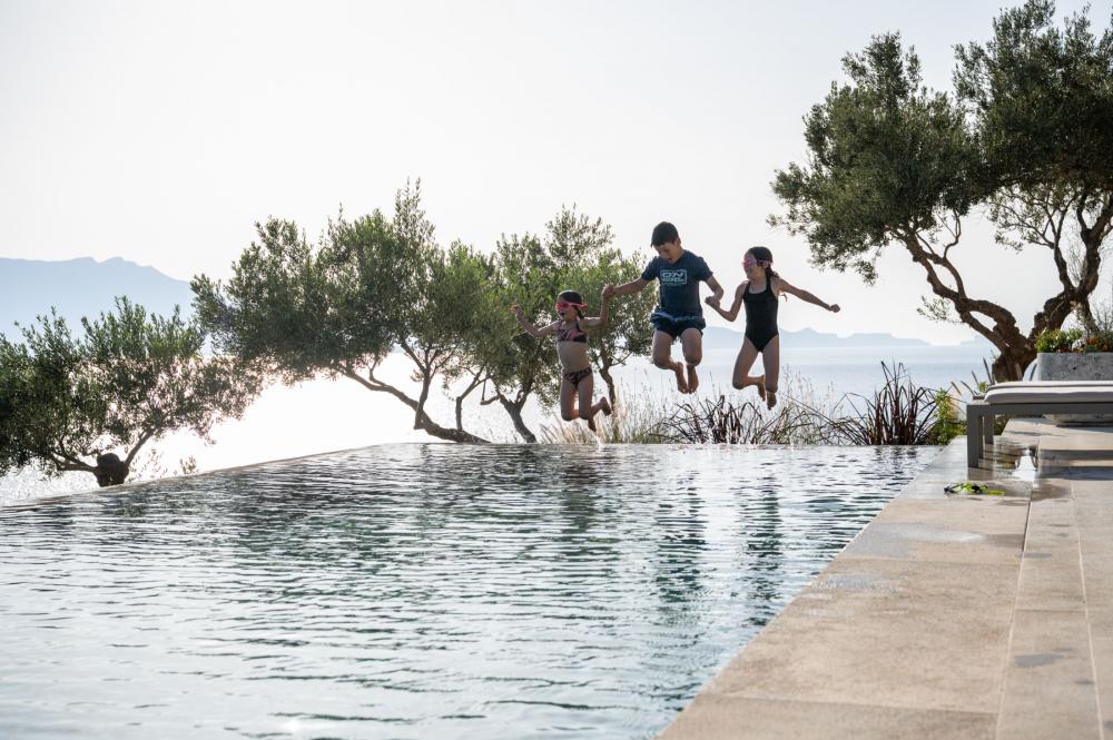 Outside, a sanctum of serenity is paired with striking scenery of the Greek coastline, providing a beautiful backdrop to your Mediterranean retreat. The infinity pool merges with the horizon, isolating guests with nothing but the sheer beauty of nature. Furthermore, a lush Greek garden is embellished with olive trees and native plants, elevating the level of intimacy between guests and nature. The outdoor kitchen and bar create the perfect setting for al fresco dining, whilst a number of luxury lounge areas, some sheltered from the sun, also allow for guests to unwind as they please with a gorgeous panoramic view to pair.
