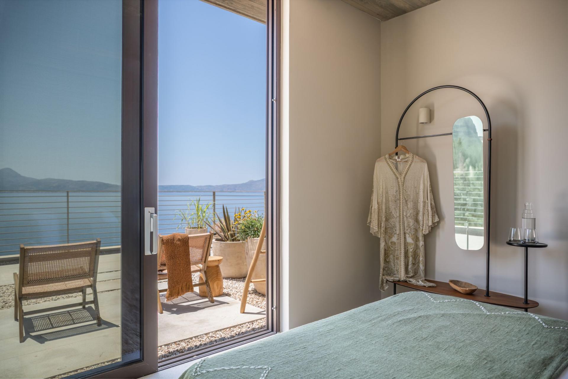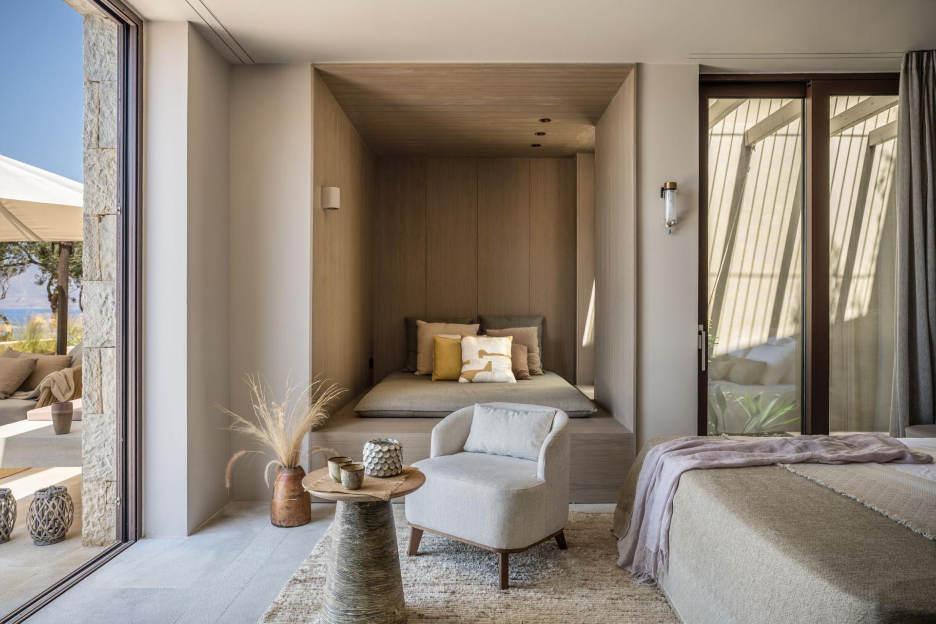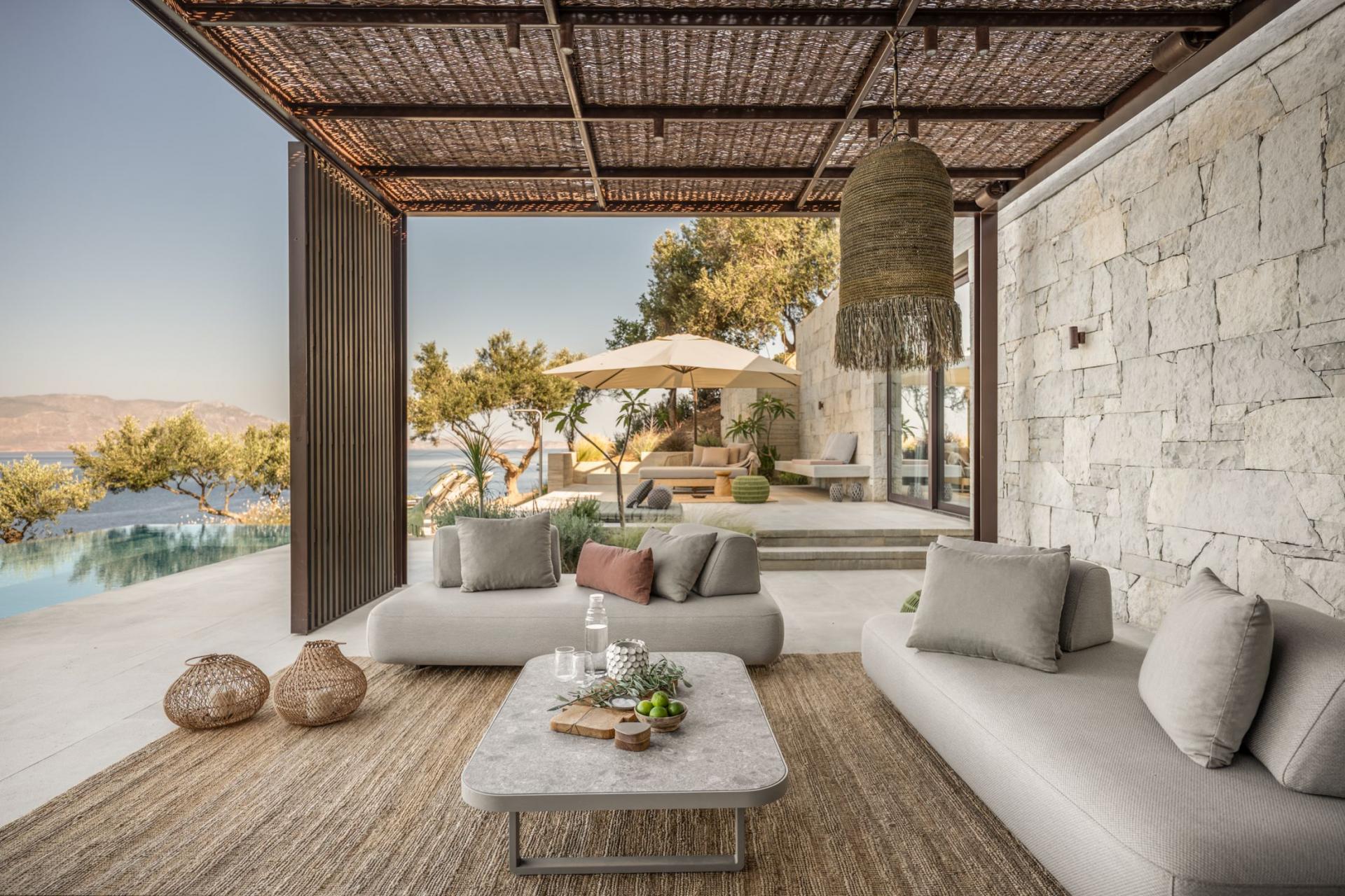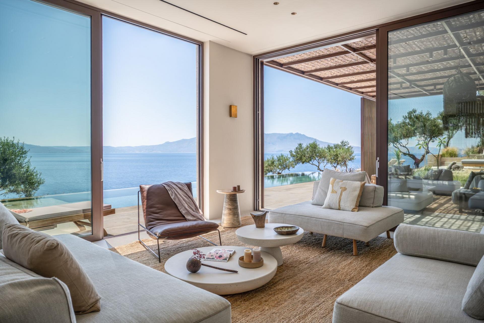 Designed to foster relaxation, Bliss House Villa's light and contemporary interiors exude a typical villa environment to enjoy. The spacious, open-plan living area welcomes you with its floor-to-ceiling windows, framing picturesque views of the Aegean Sea. Plush chairs are the best seats to marvel at the views, dotted around the open-plan layout amongst a neutral colour palette. The lounge connects seamlessly to a central dining area and the villa's fully fitted kitchen, not to mention the outdoor terrace areas too.