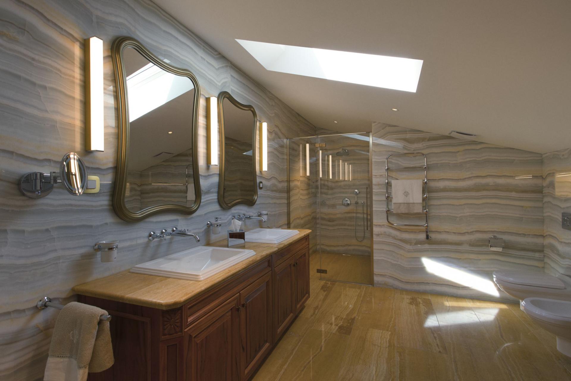 Captain's Villa Rouge can accommodate for up to 14 guests across seven bedrooms. The bedrooms continue the villa's sophisticated design, ensuring high standards of elegance and luxury are consistent across every floor. Large windows allow for plenty of natural light to highlight tall ceilings, regal decor and plush soft furnishings inside each room. Marble en-suite amenities and access to outdoor spaces are present for the majority of rooms. On the top floor, lies two bedrooms, one of which is open to a living area, dining space and kitchen.