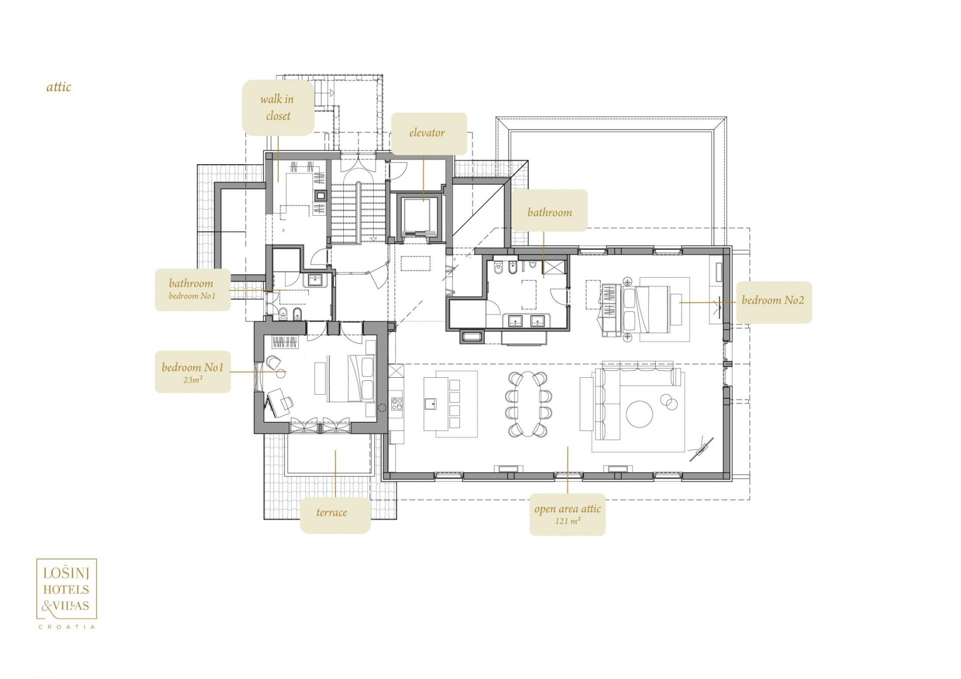 The villa also offers spa and wellness amenities for ultimate rejuvenation. Found on the property's basement level, a sauna and Hammam offer guests a chance to switch off after a busy day of island exploration. A fitness room is also available to keep up with workout routines on your luxury villa holiday in Croatia.