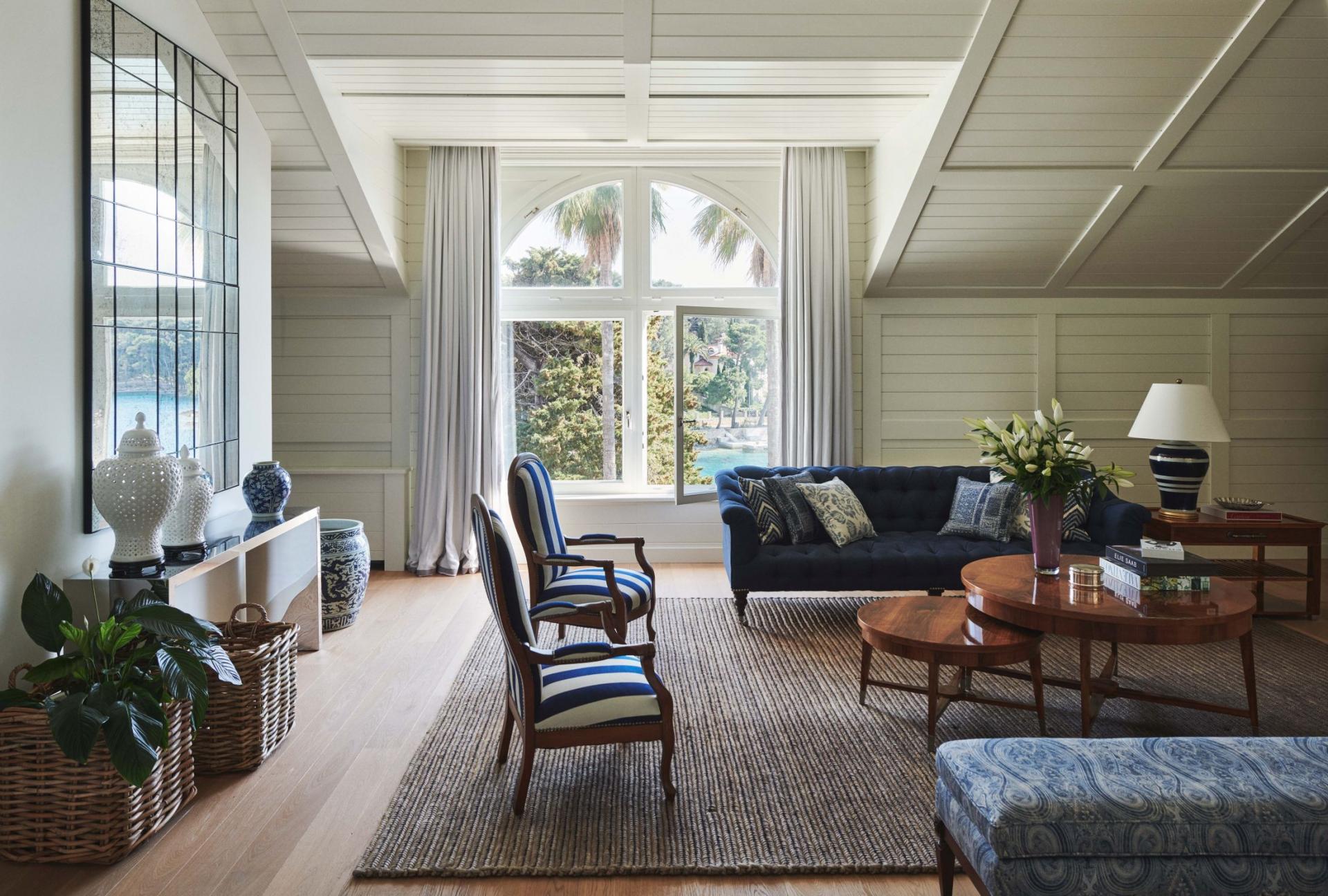 Villa Hygeia welcomes its guests into regal, grand interiors that exude a style found from the Belle Époque period. Modern yet historic in its appearance, the villa flaunts stylish Prussian blue interiors and a myriad of artwork that perfectly coordinates with the sea's cobalt tones and luscious vegetation outside to provide a place of peace. Across open-plan layouts, an abundance of natural light floods through large windows framing blue skies and sweeping views of the verdant garden before the backdrop of the Adriatic's shimmering waters. Throughout the living spaces, mainly found on the villa's ground floor, there's a seamless transition for guests to unwind, effortlessly blending indoor elegance with the serene outdoor surroundings beyond.