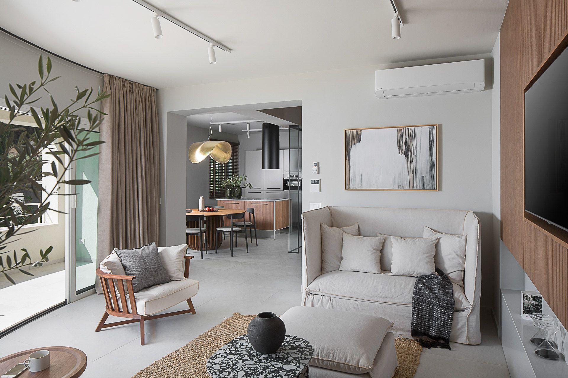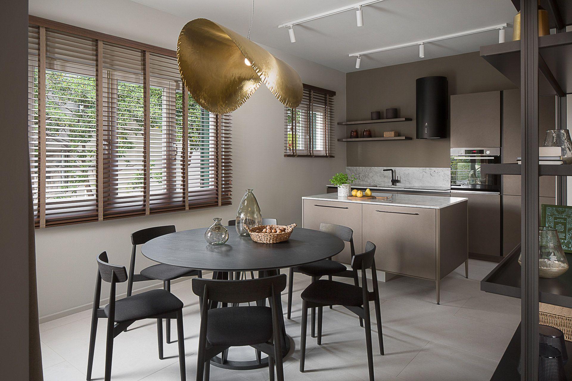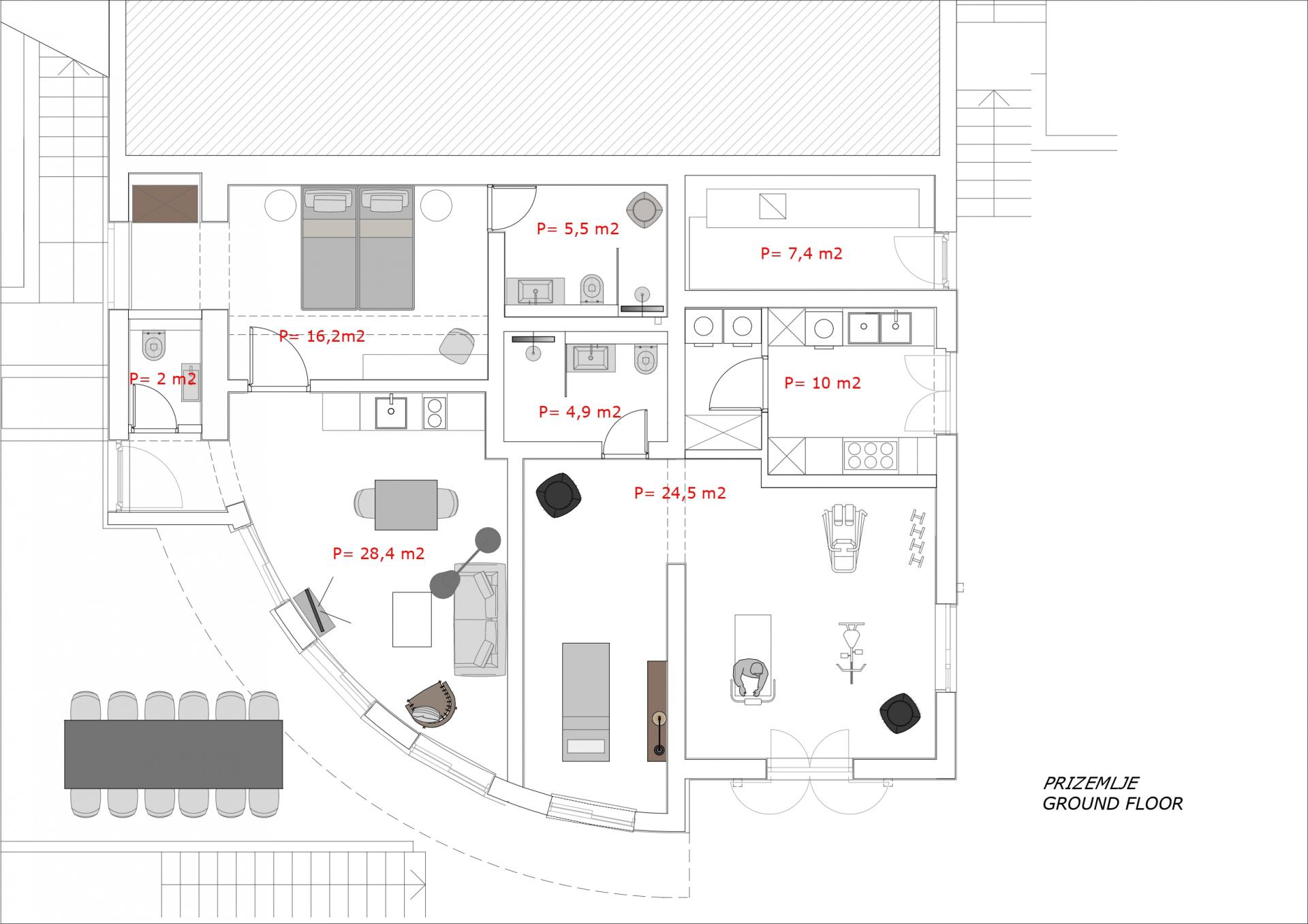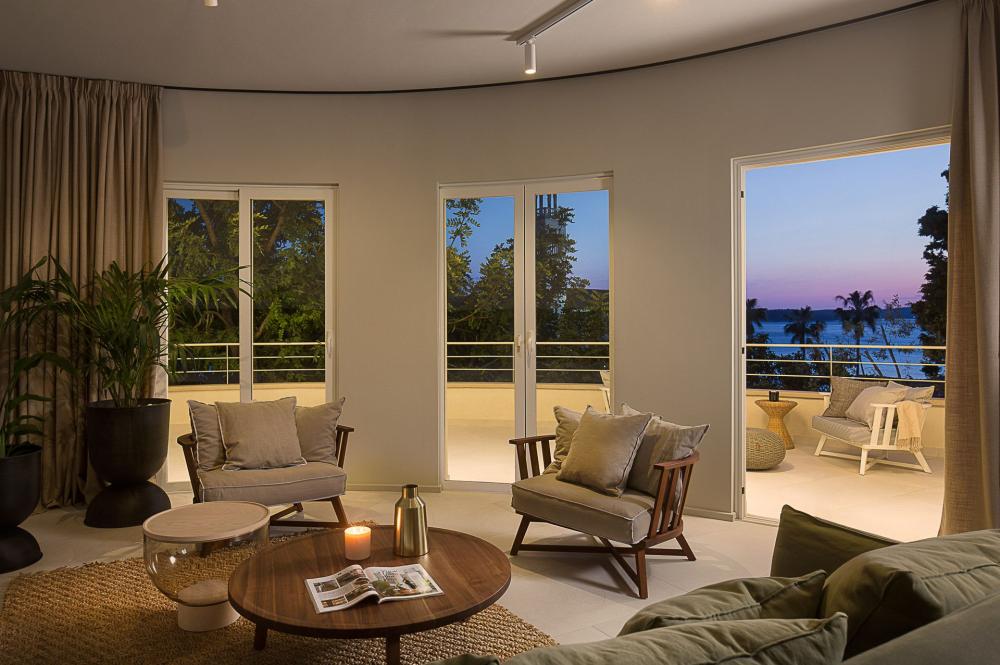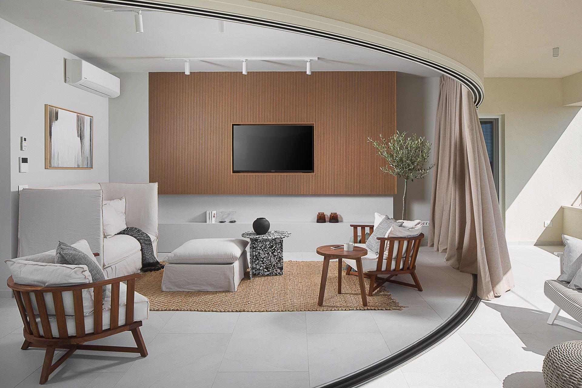 Inside, the villa features an open-plan living area on each floor, blending modern furnishings with soft hues, recalling the serene landscape. On the three lowest levels, the sitting areas sit in a feature curved wall space, that opens onto either a balcony or terrace. On the top level, the living area sits under the eaves with a comfy L-shape sofa to recline into. This area leads out onto the roof terrace, with an outdoor kitchen and dining area. There are also two further kitchens and smaller dining spaces on the floors below, making it easy to create meals, snacks and beverages to take out to your chosen rest spot. The set-up is perfect for multi-generational trips or a couple of families, as each party can enjoy their own space with ease.