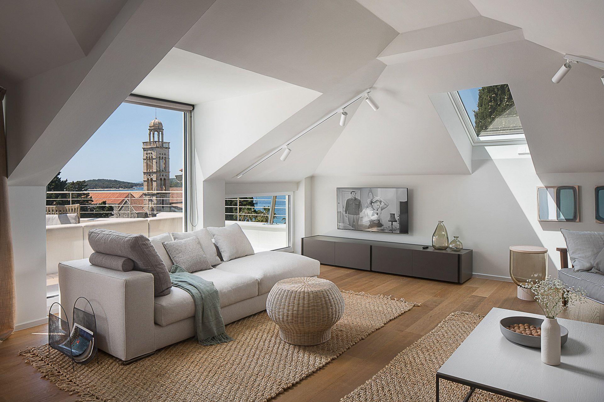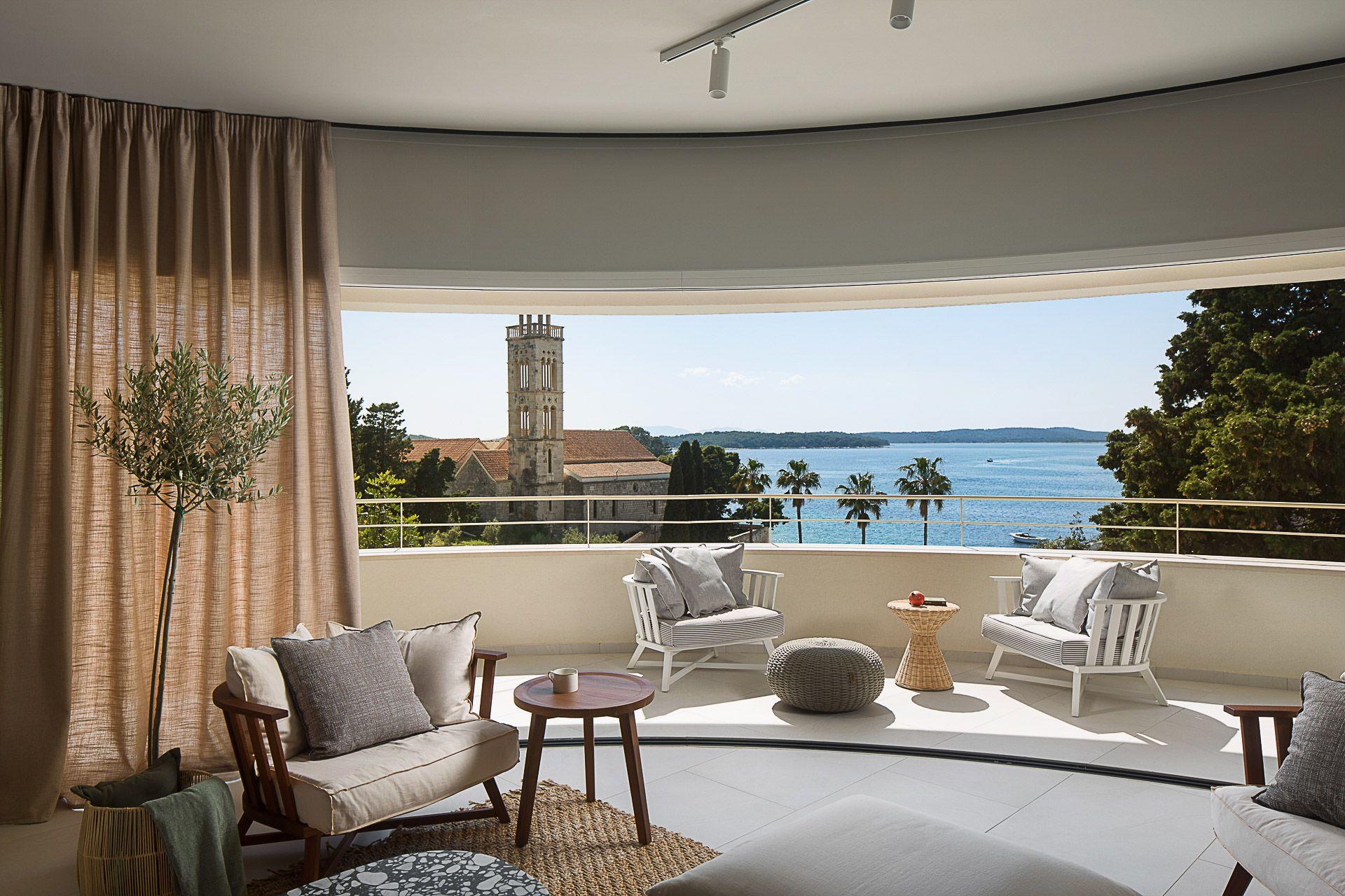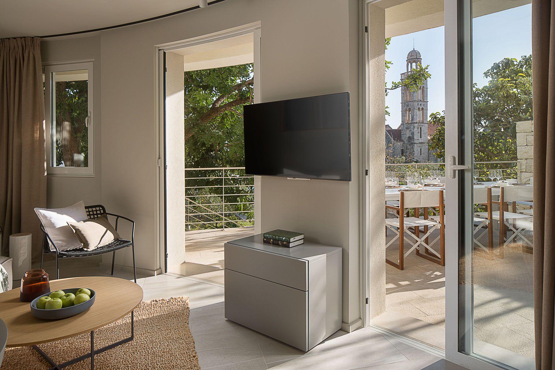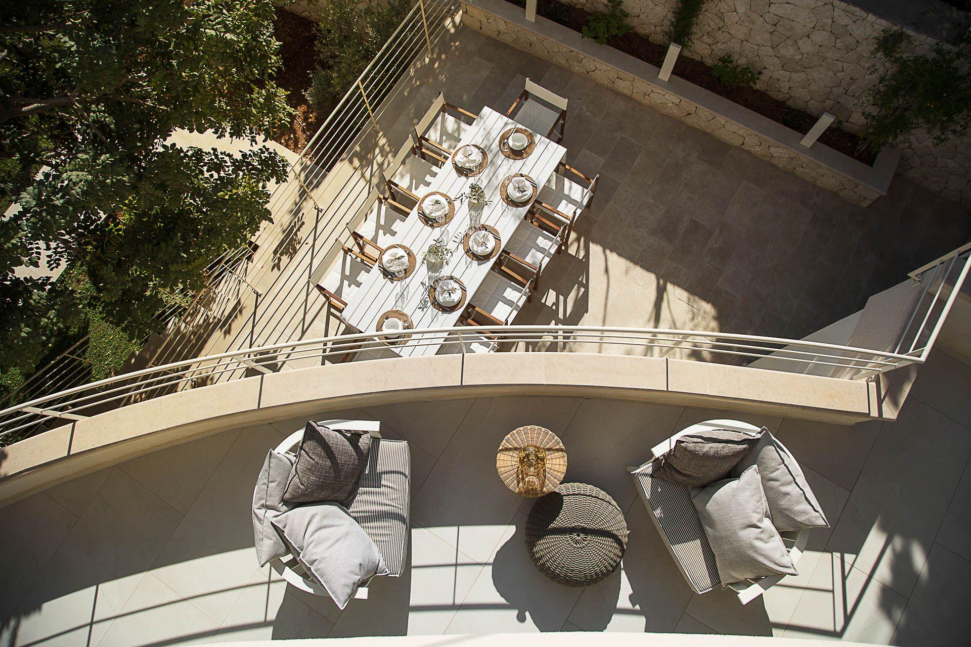The outdoor spaces of Villa Teodora have been carefully designed to take advantage of the beautiful surroundings. The villa is surrounded by lush green gardens and offers many tranquil corners for soaking up the glorious sunshine. On the garden level you will find a long dining table, perfect for the whole group to come together for meals. There are also plenty of loungers and balcony seating for relaxing on. The views of Hvar Town are best enjoyed on the roof terrace, where you can find an outdoor lounge area, shaded under a fabric canopy.