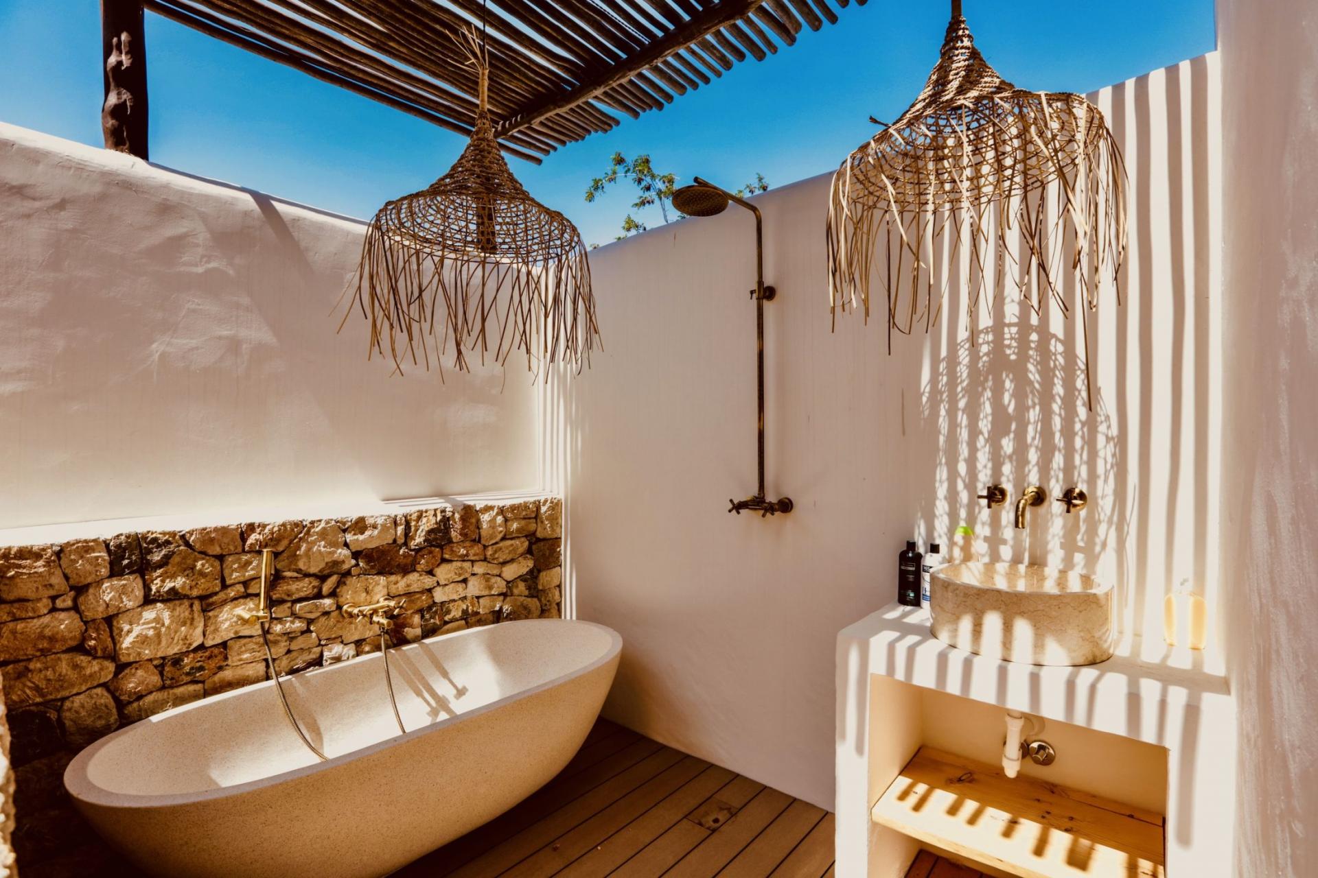 The 6 double bedrooms at Can Gerbera are all en-suite rooms featuring soft furnishings and light textures that formulate an elegant yet homely feel throughout. Whilst four of these bedrooms are located in the main villa, the remaining two can be accessed externally, one of which offers a great view overlooking the swimming pool. Depending on your room choice, guests can enjoy a tropical outdoor shower or bath in the beautiful summer heat. However, the master bedroom oozes comfort and class with its private roof terrace that contains a hammock and several lounge areas, elevated by the incredible views ahead.