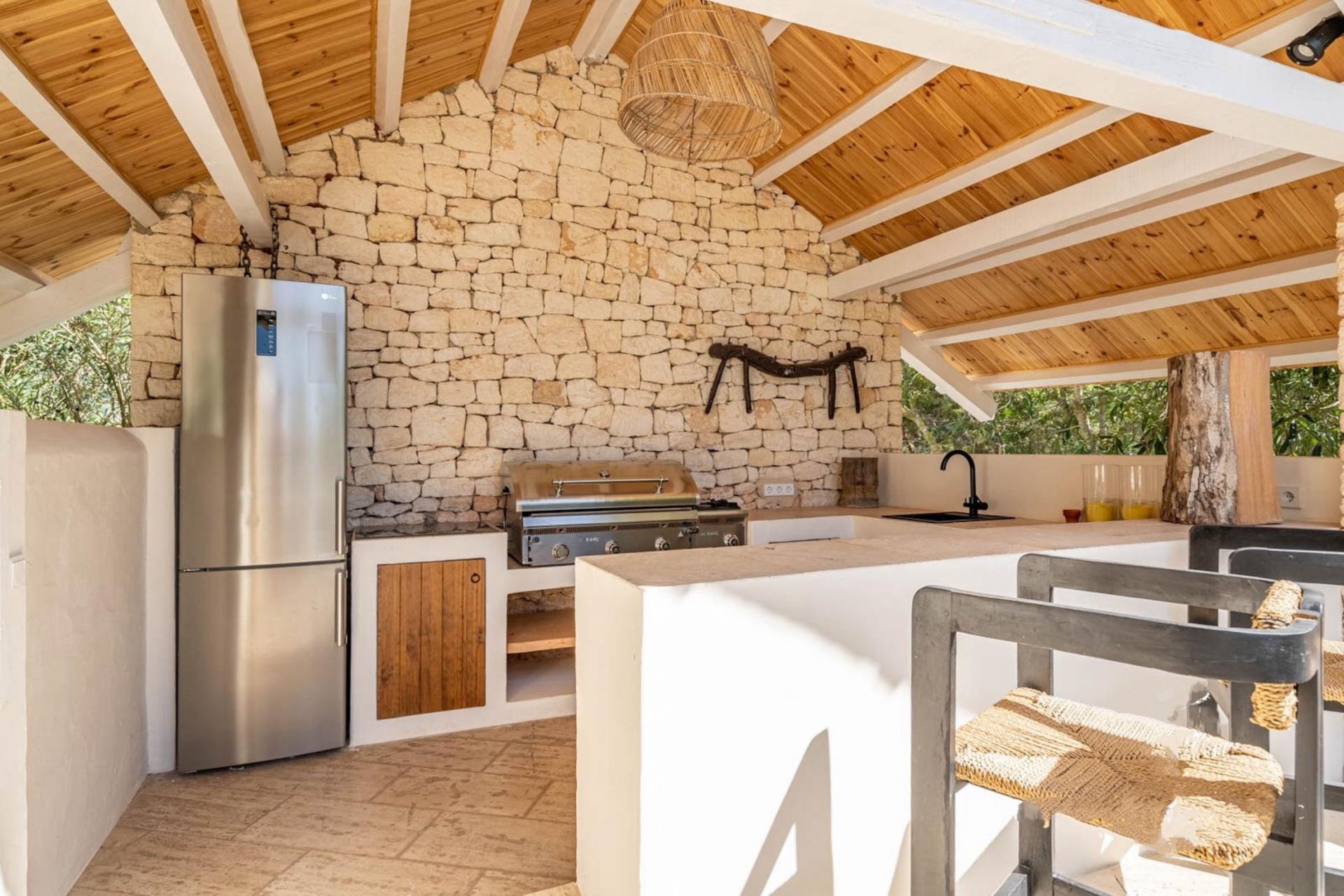 Can Gerbera recalls a seamless flow between its interiors and outdoor settings, with a choice of sheltered seating areas under luscious vegetation and a magnificent covered double lounge proving perfect for moments spent in the shade. The property's stone and white exterior creates a pleasant space to relax on various comfortable furnishings, soaking in charming surroundings and far-reaching views beyond the villa's manicured gardens. An outdoor kitchen and BBQ, and separate bar corner, give sufficient space for refreshments to be arranged as you unwind.
