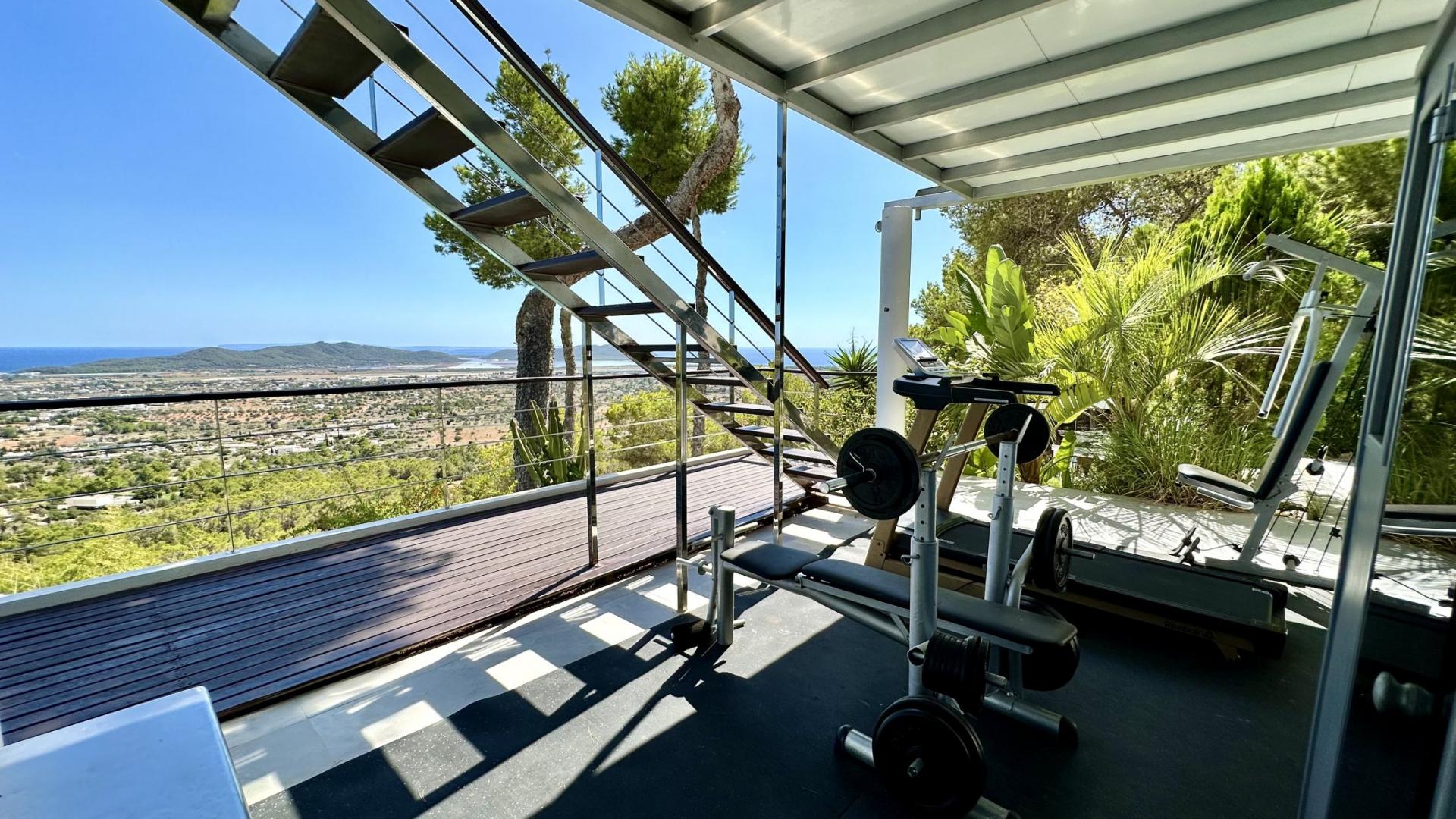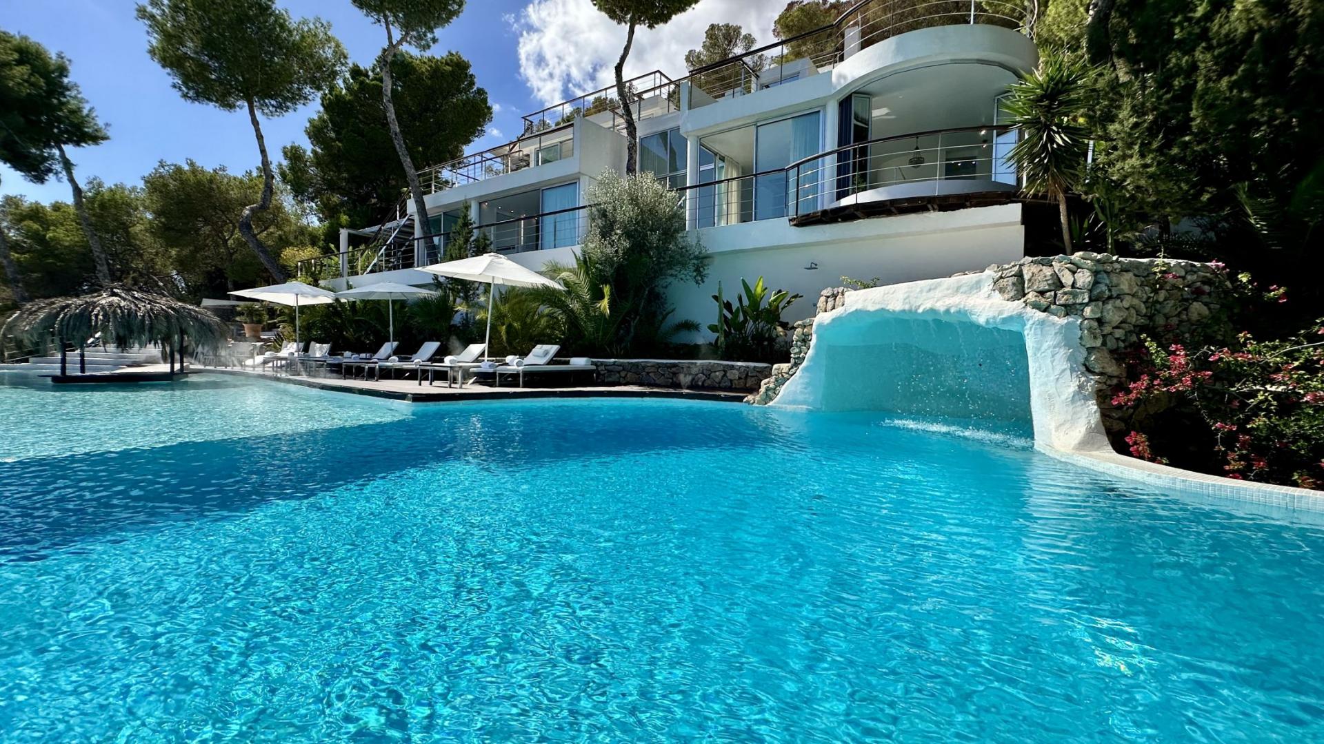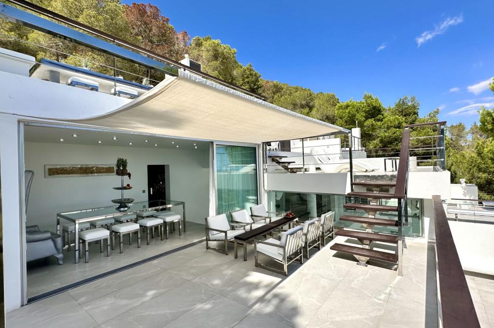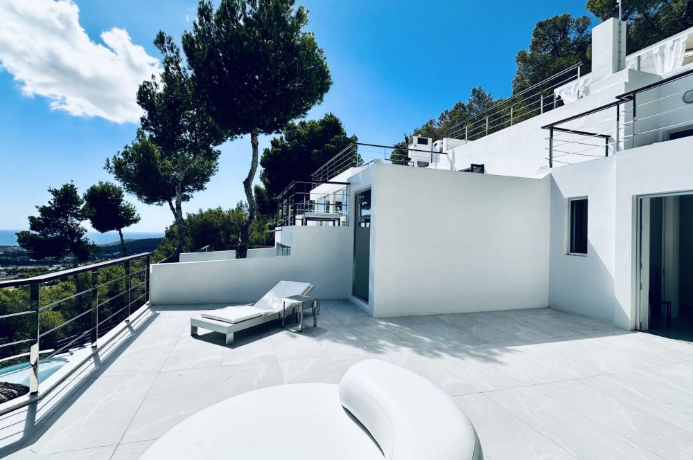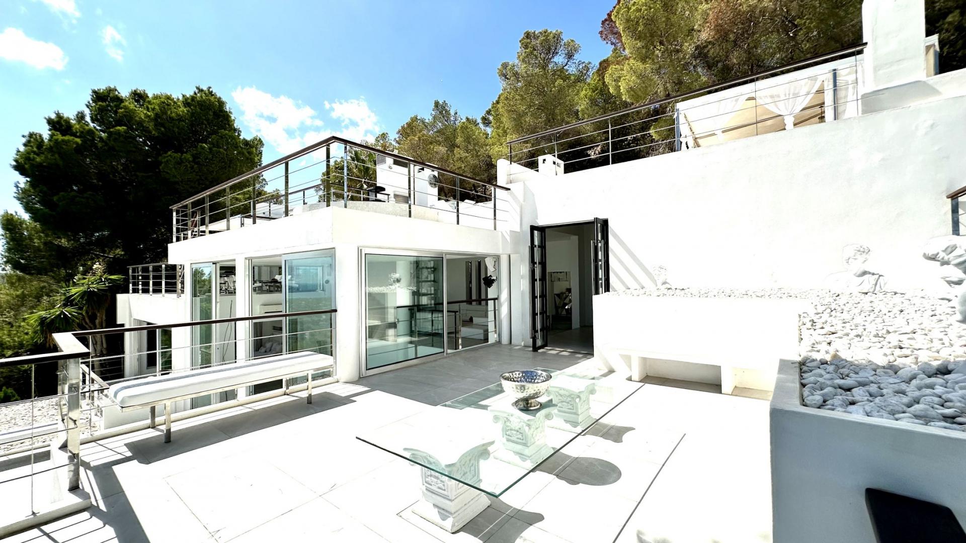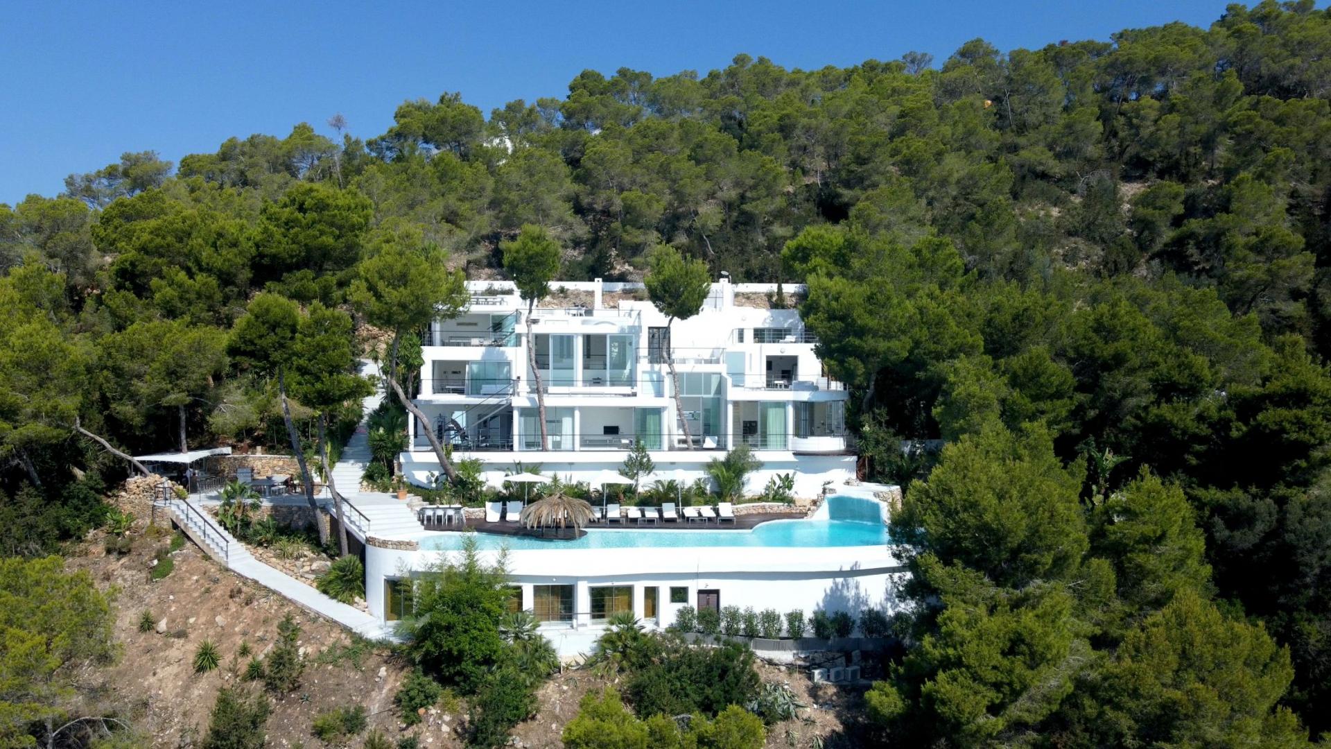 Ultra-modern mansion carved high into the solid rock, (200m above sea level) atop the Truntoi mountain range, amid its own 120,000sqm mature pine forest. The villa offers spectacular 180 degree panoramic views (from Ibiza Old Town to the beaches of Salinas, Es Codolar and the Island of Formenterra, and es camp del Falk).