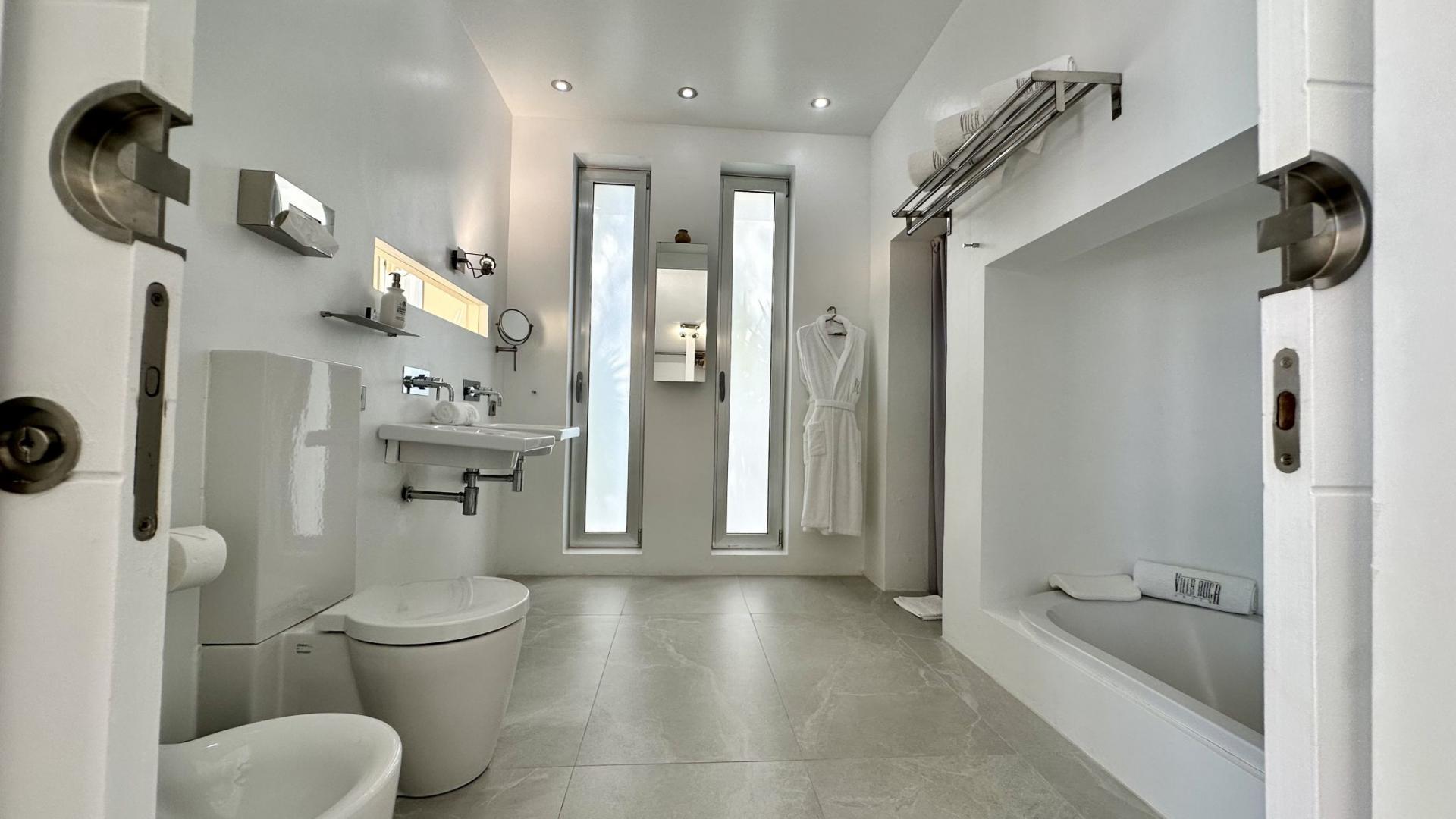 The villa boasts 8 double bedroom suites all with breathtaking views, DVD, sound system, flat screen satellite TV, air-conditioning, mini-fridge internal telephone system etc. There are 8 bathrooms and 3 guest toilets.