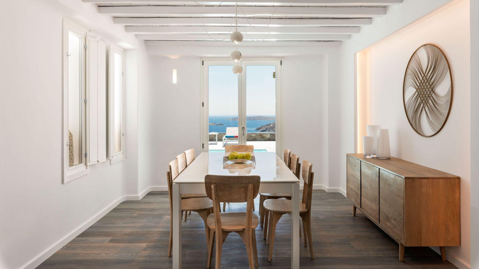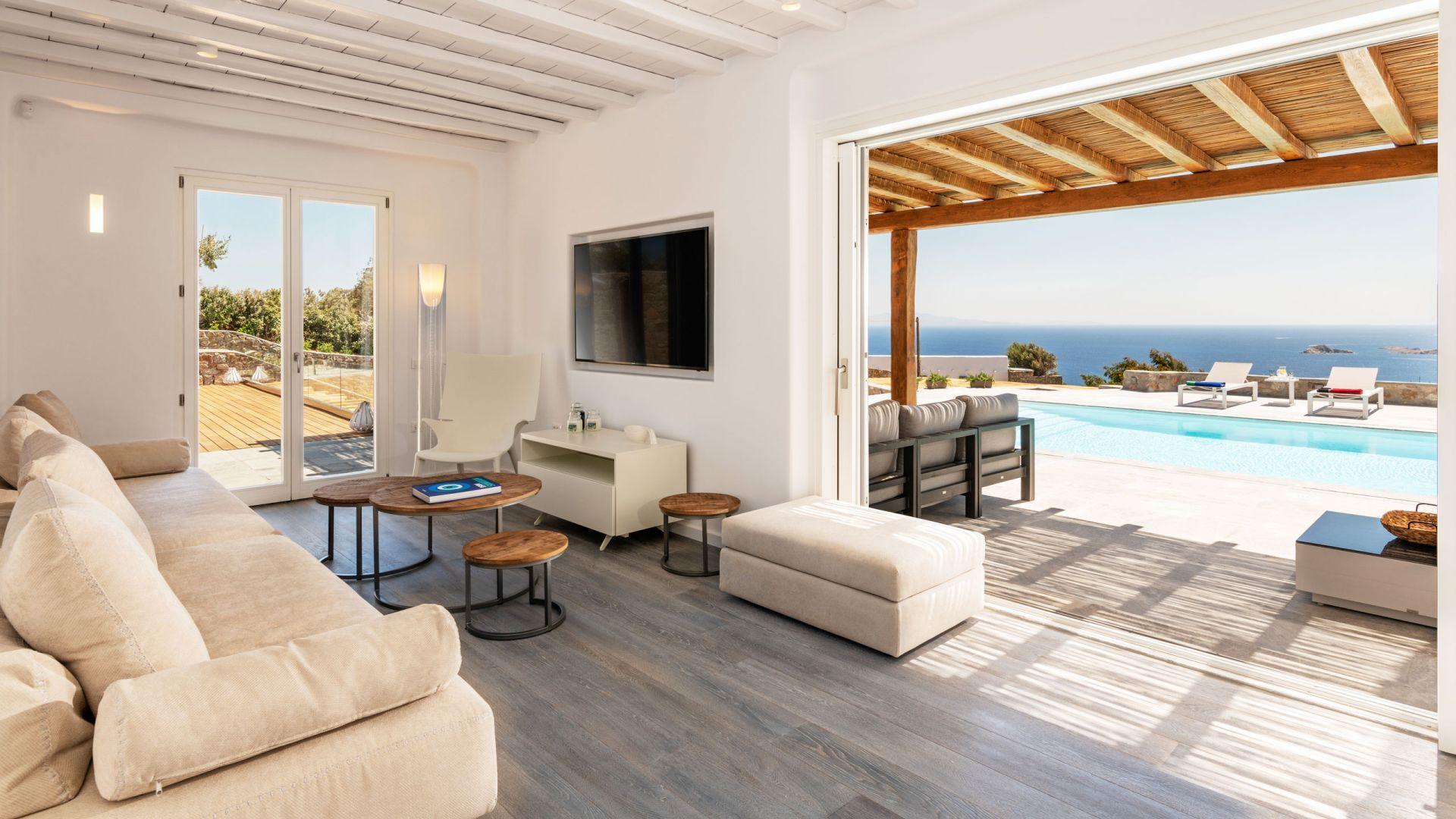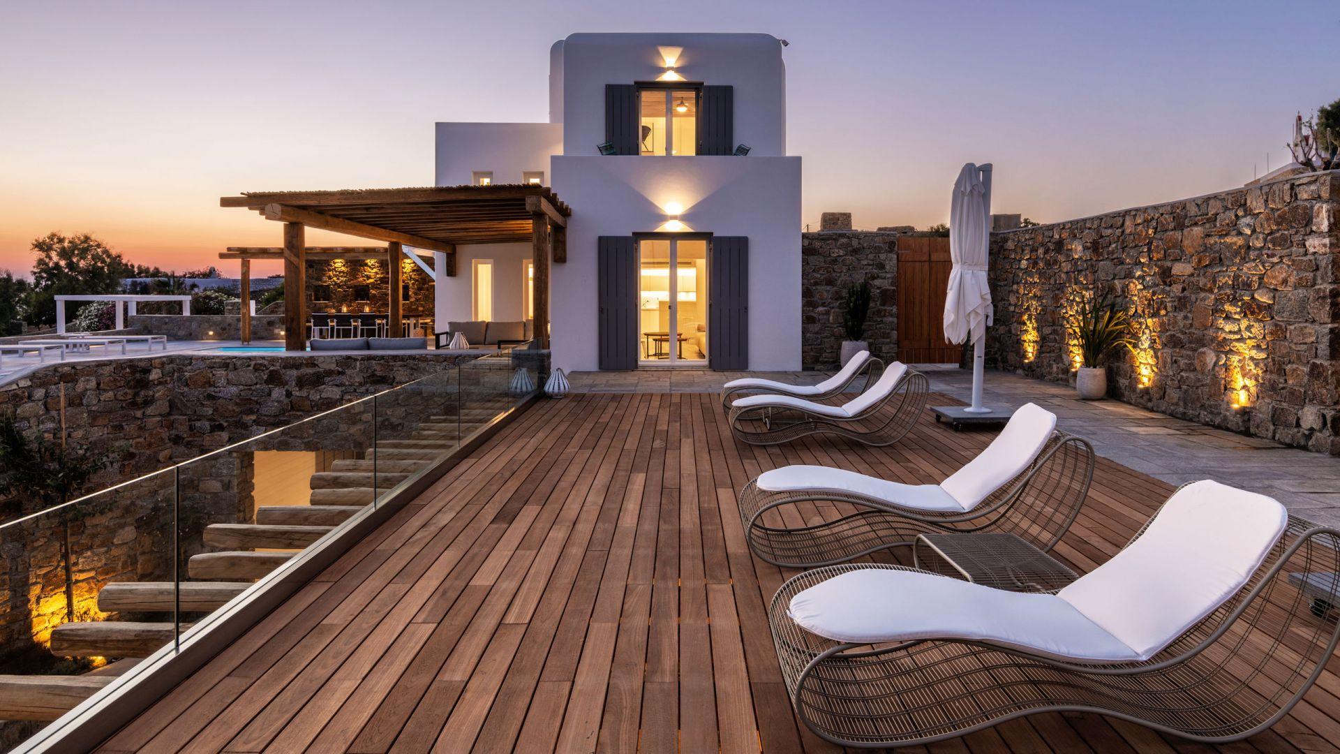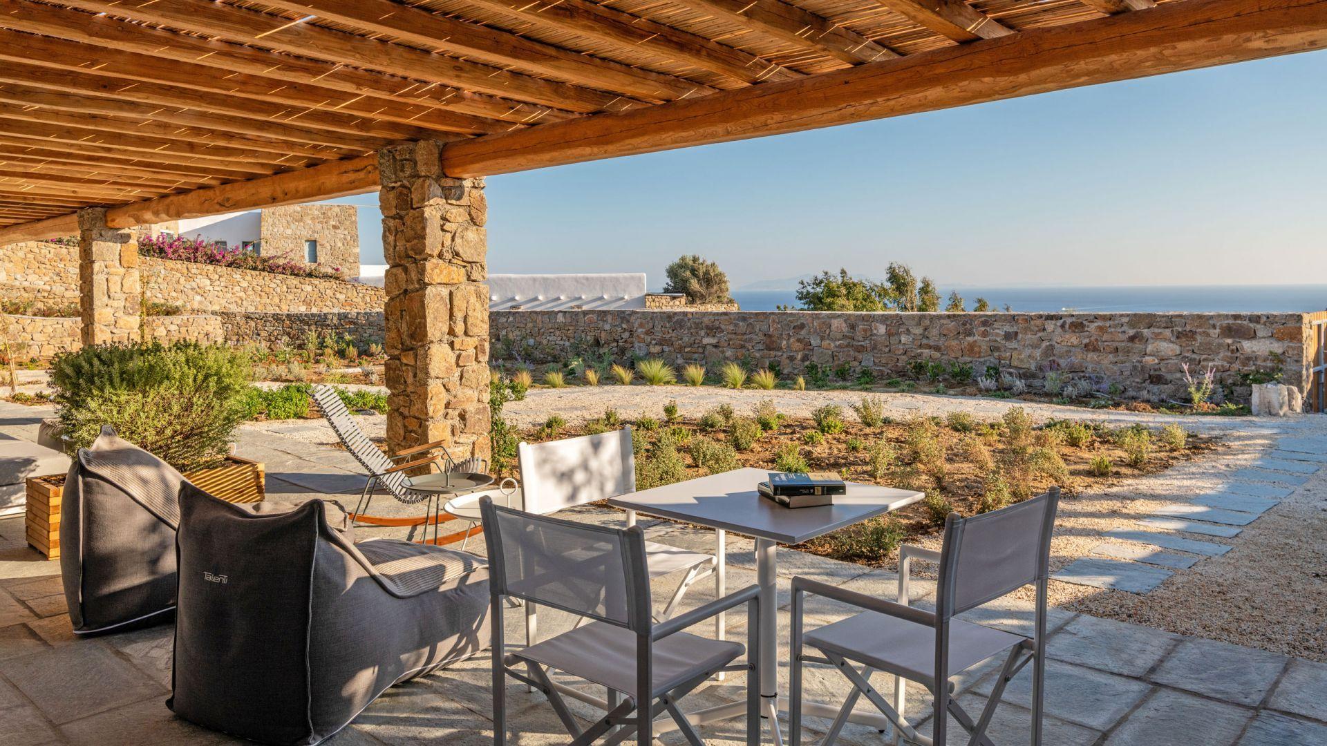 Sara's Garden's crown jewel lies in its outdoor space. Split over two terraces, there is an abundance of lounge and relaxation areas to enjoy. Enjoy a cocktail on the sun loungers poolside, or on the nearby decking. On the lower terrace, large shaded areas offer plenty of space for the whole group to relax. An alfresco dining area allows for beautiful lunches of fresh Greek food with stunning views to match. As the temperatures rise, slip into the outdoor swimming pool and admire the yachts as they cruise through the bay below. With the sun beginning to set, the horizon comes alive with breathtaking colours, offering an unforgettable transition from day to night.