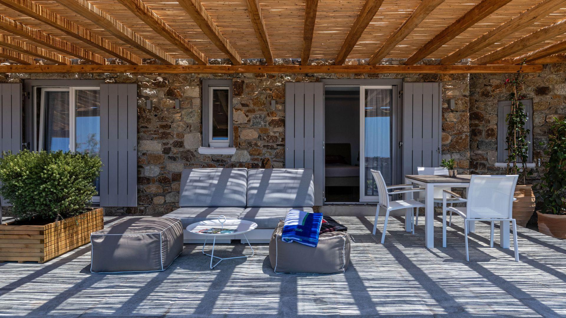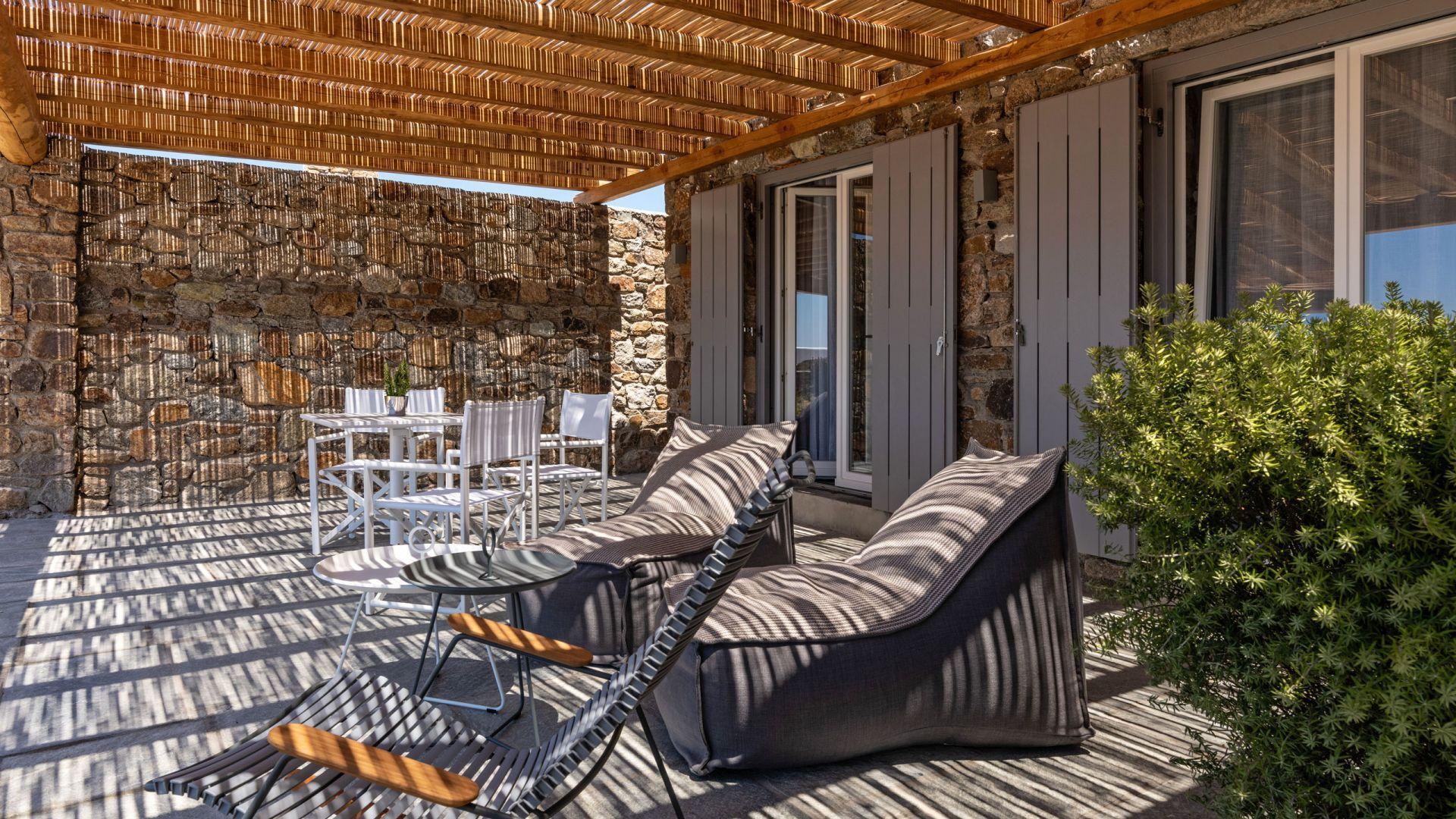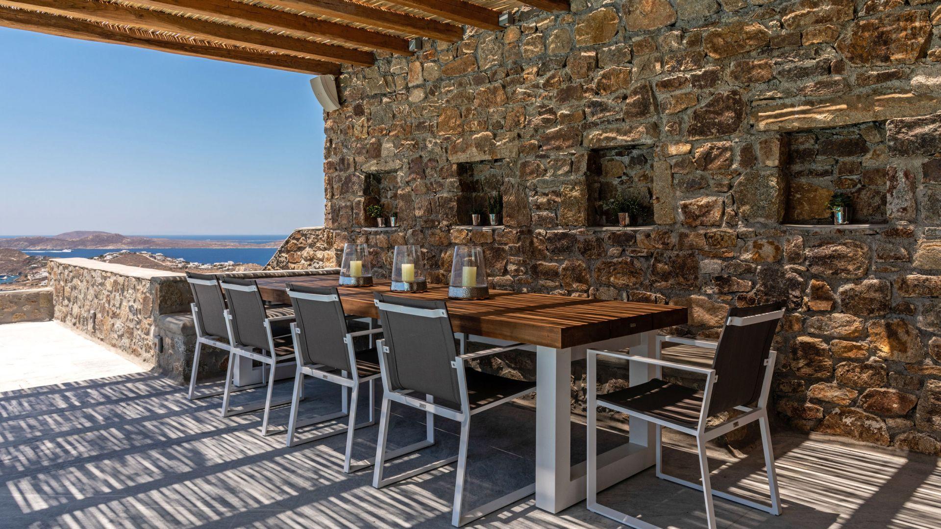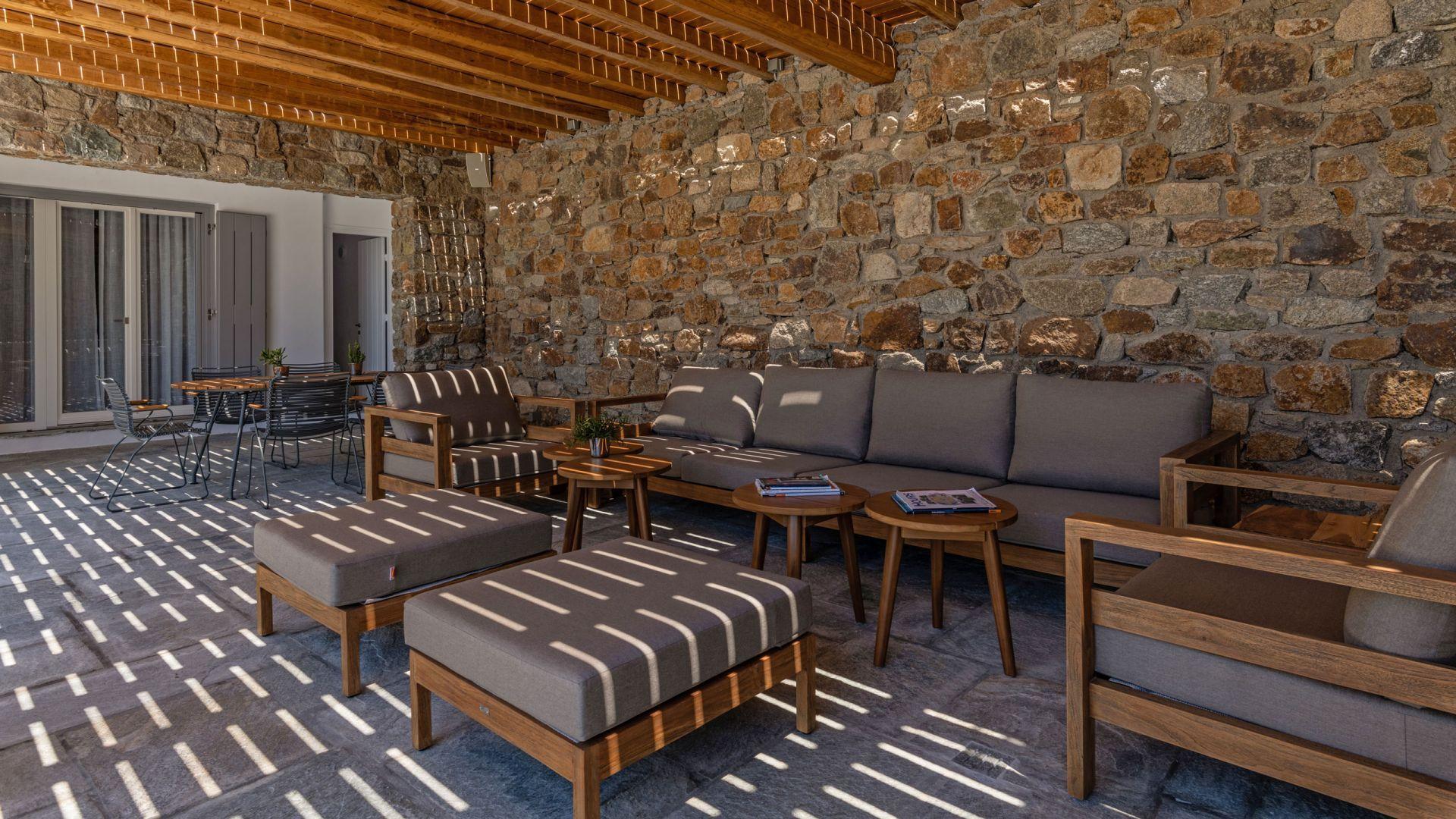 Sara's Garden's crown jewel lies in its outdoor space. Split over two terraces, there is an abundance of lounge and relaxation areas to enjoy. Enjoy a cocktail on the sun loungers poolside, or on the nearby decking. On the lower terrace, large shaded areas offer plenty of space for the whole group to relax. An alfresco dining area allows for beautiful lunches of fresh Greek food with stunning views to match. As the temperatures rise, slip into the outdoor swimming pool and admire the yachts as they cruise through the bay below. With the sun beginning to set, the horizon comes alive with breathtaking colours, offering an unforgettable transition from day to night.