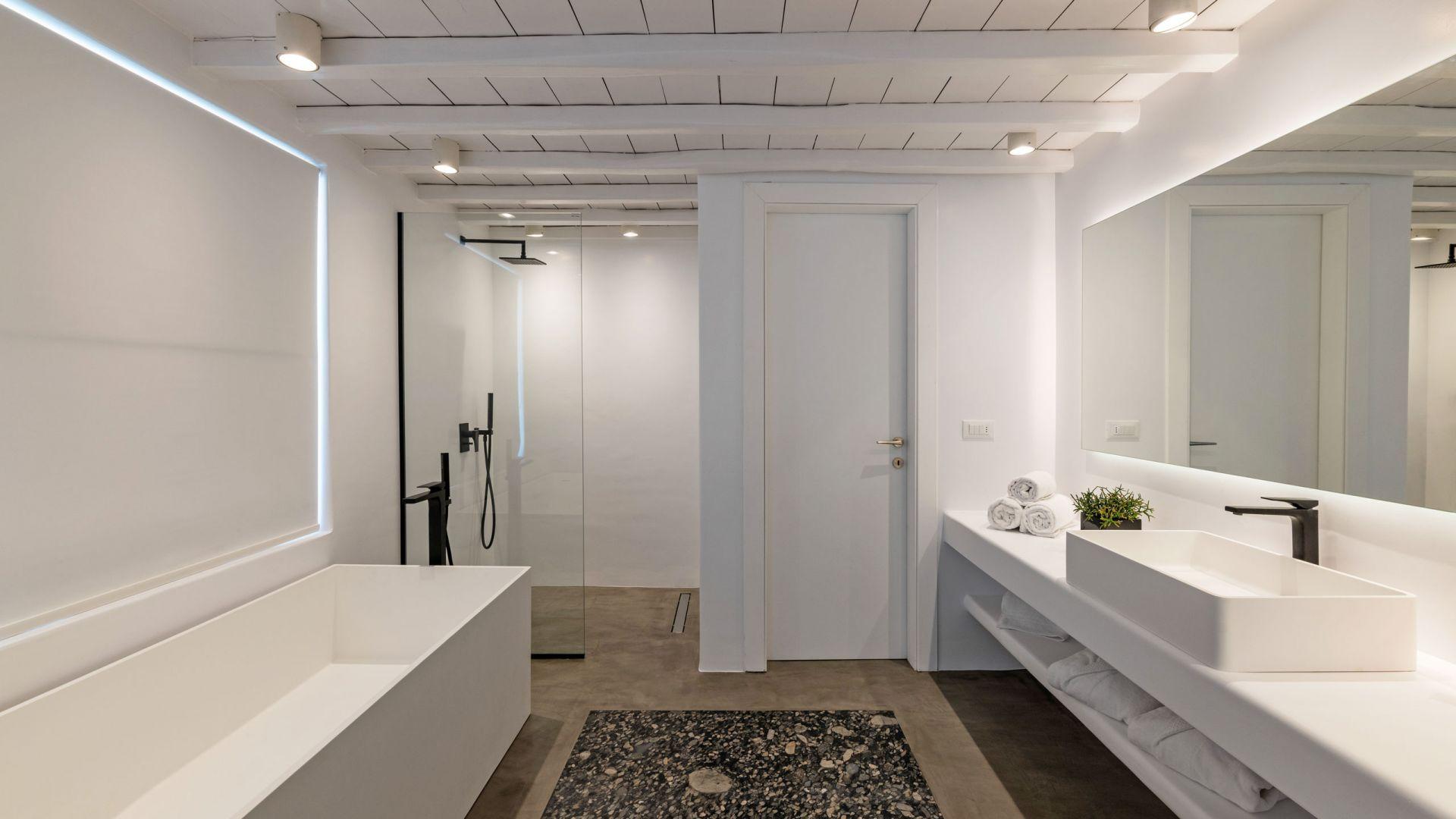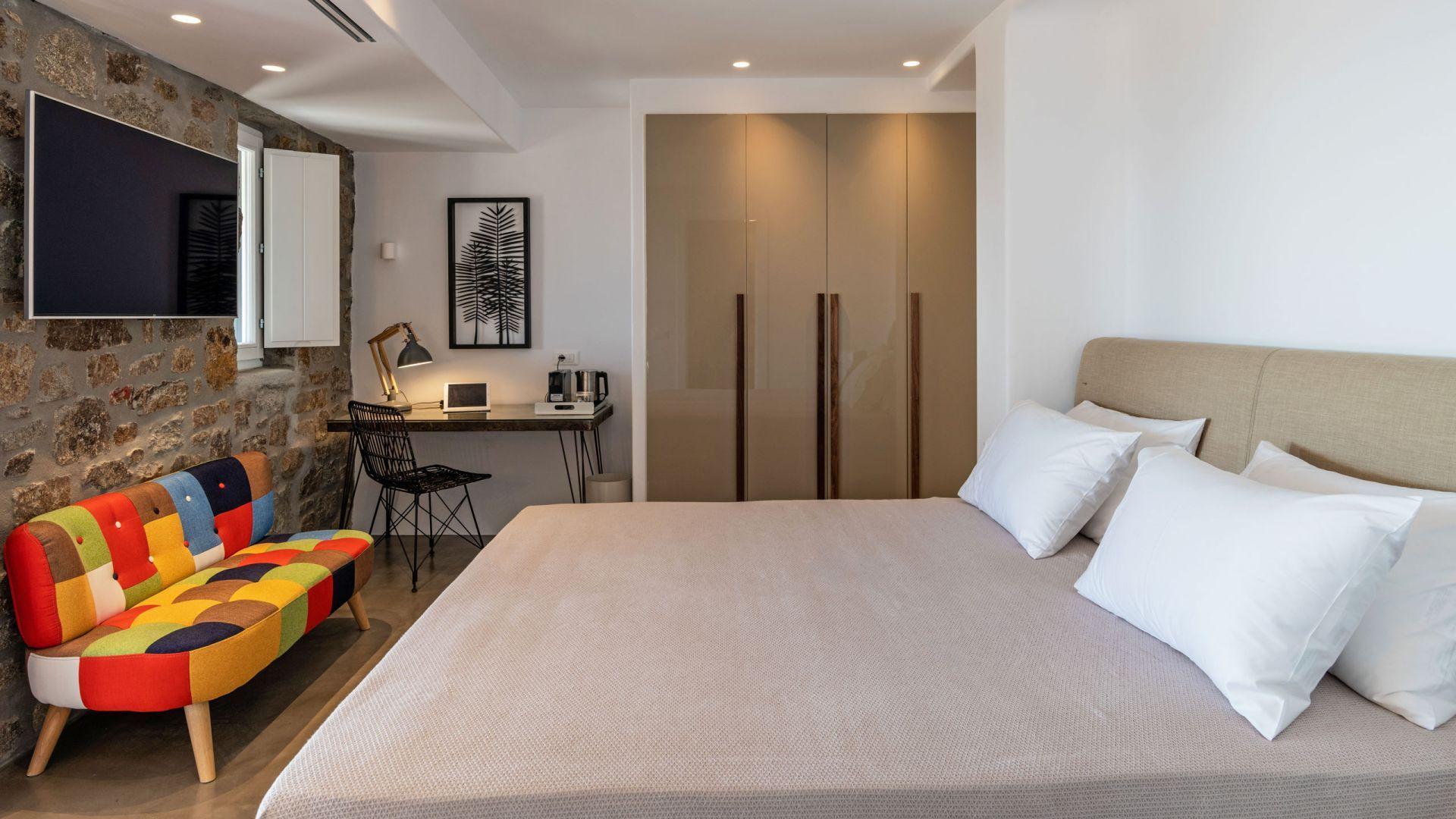 Spread across 6 spacious and well-appointed bedrooms, Sara's Garden can comfortably accommodate 12 guests. The rooms blend traditional Greek design with neutral tones and stylish pops of colour. The bedrooms are split across two sections, with 3 rooms in the main house and the remainder in the guest wing. All bedrooms boast access to lounge areas, allowing you to unwind and have a moment of solace if needed. The master bedroom is split over two floors and has its own private studio. As an added luxury, all bedrooms within the villa come with their own en-suite facilities.