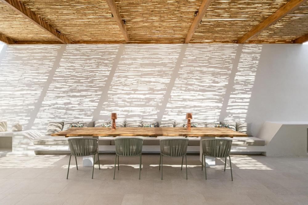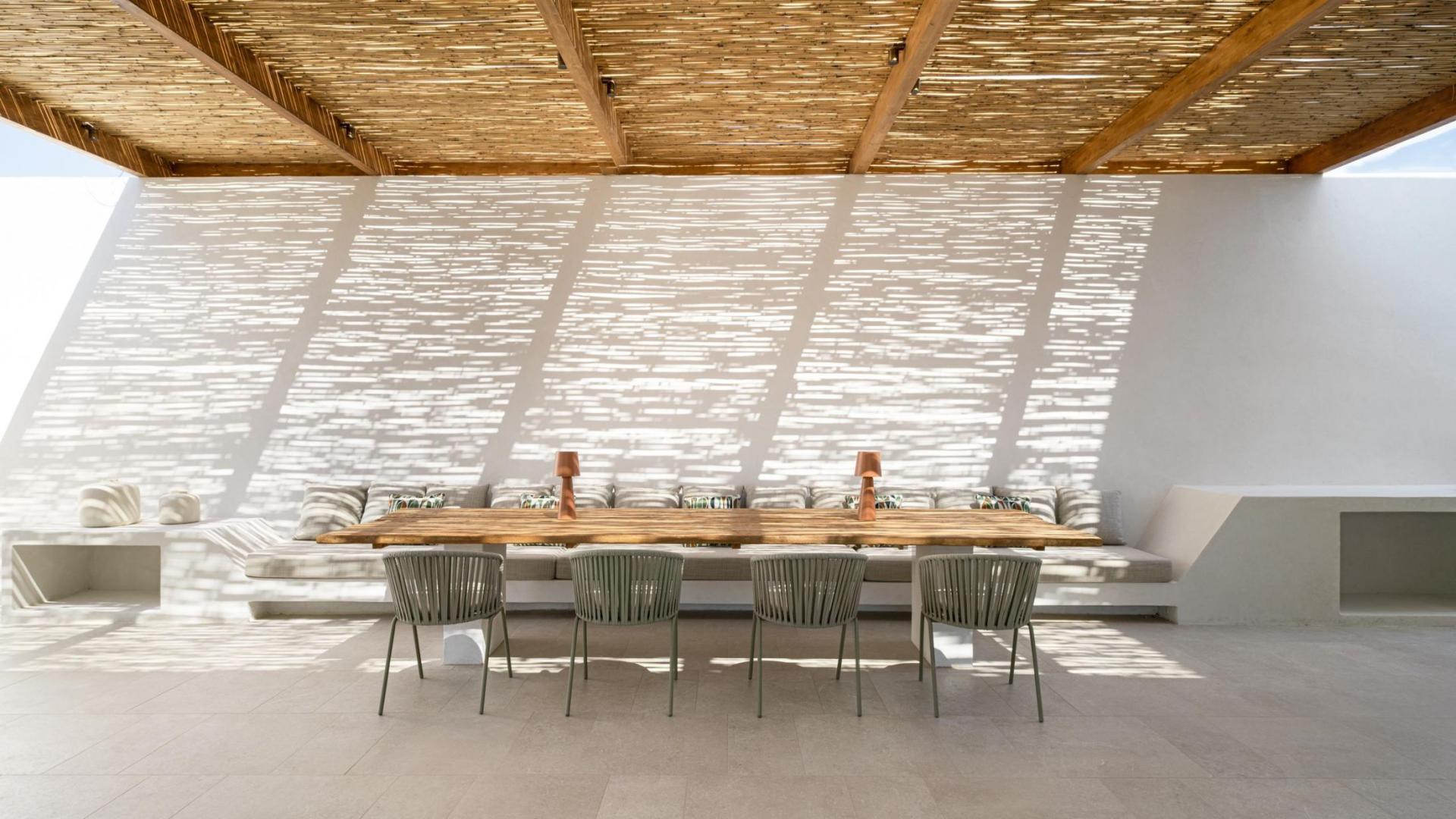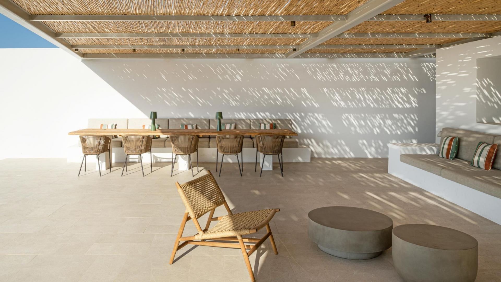 Stepping outside, guests are welcomed onto The Wanderer's generous terrace designed for outdoor living. A shaded dining area provides the perfect spot for long lunches and evening meals, whilst additional seating areas invite moments of calm with views stretching out towards the sea. The layout has been carefully considered to allow guests to enjoy the outdoor spaces throughout the day, whether seeking shade or sunshine.