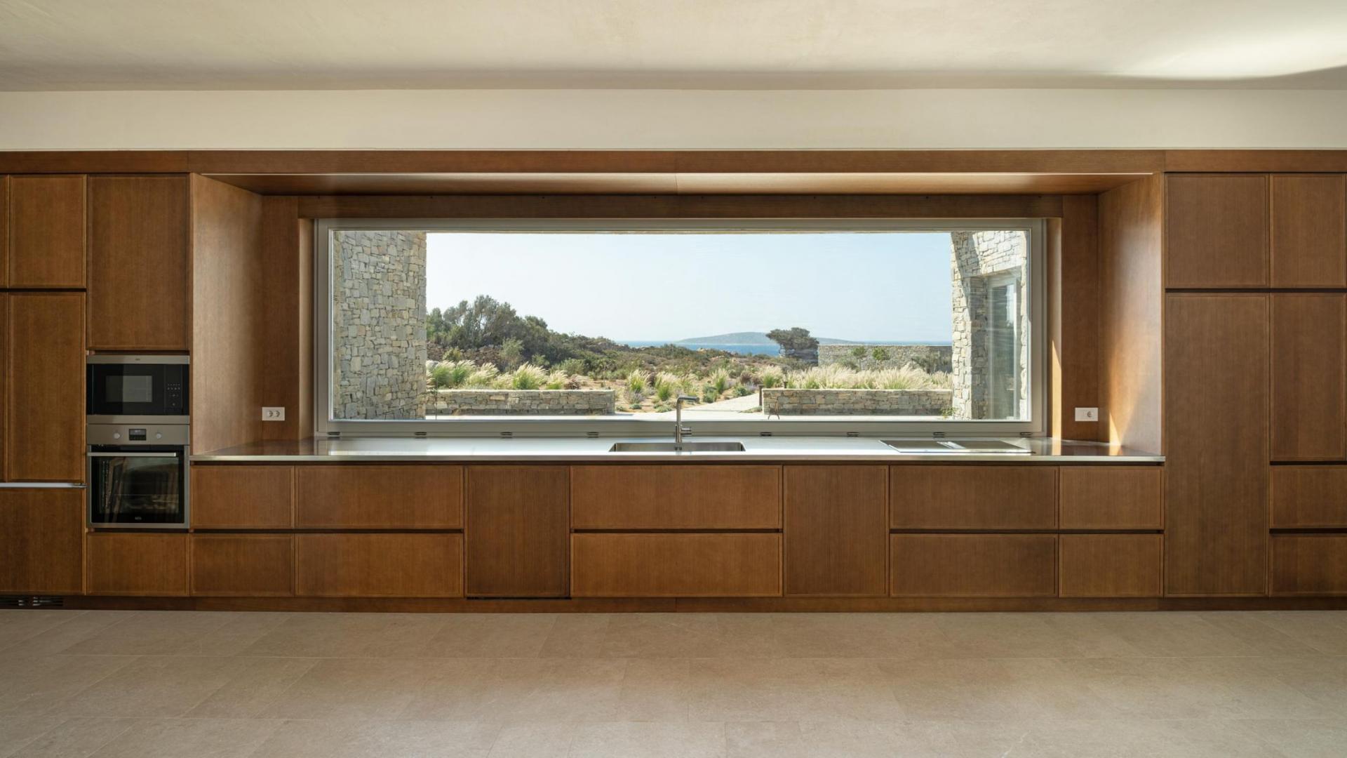 The villa showcases a modern Mediterranean style, blending soft neutral tones with natural materials and thoughtful design touches throughout. The main living space is light and airy, with large sliding doors framing the sea views and allowing natural light to flood the room. Comfortable seating invites guests to unwind, whilst the open-plan layout flows seamlessly through to the contemporary well equipped kitchen and dining area, creating a sociable space ideal for meals and relaxed evenings together.