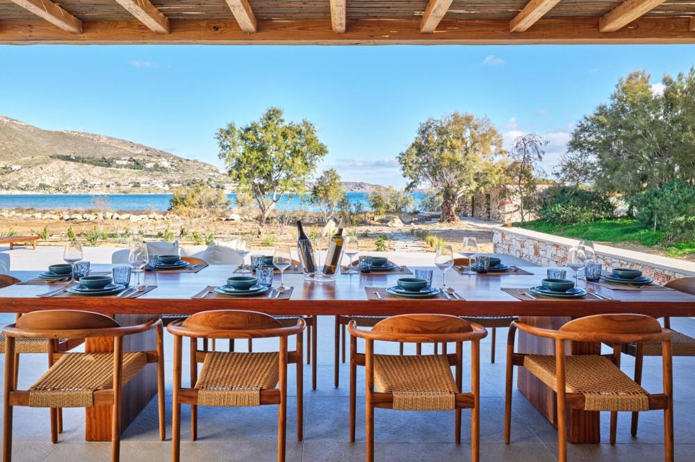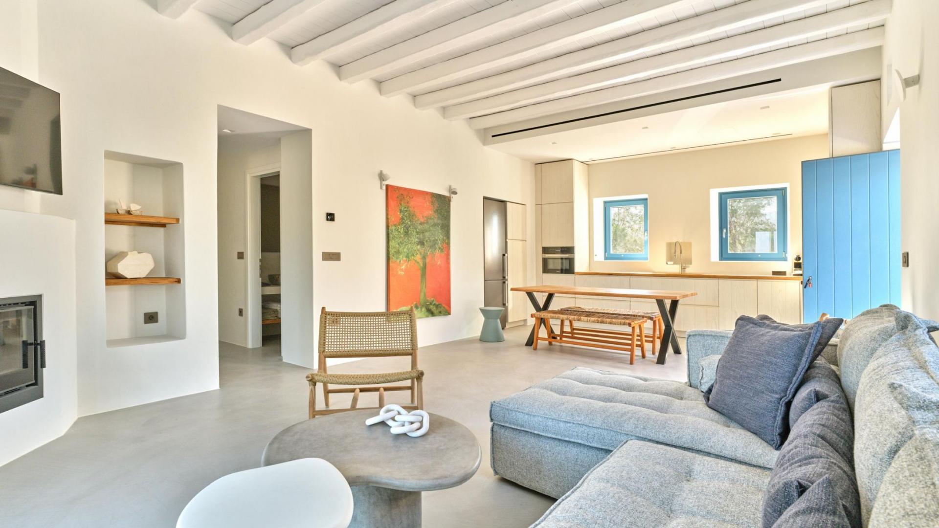 The villa sits in an idyllic location to discover the island's natural beauty and authentic charm, showcasing influence across its stylish living spaces. Inside, the interiors of Villa Litus are bright, refined and thoughtfully designed. Neutral tones and natural textures complement the surrounding landscape, while large windows allow natural light to flood the living spaces and frame the beautiful coastal scenery. The open plan living and dining area flows effortlessly towards the outdoor terraces, creating a seamless connection between indoor comfort and outdoor living.