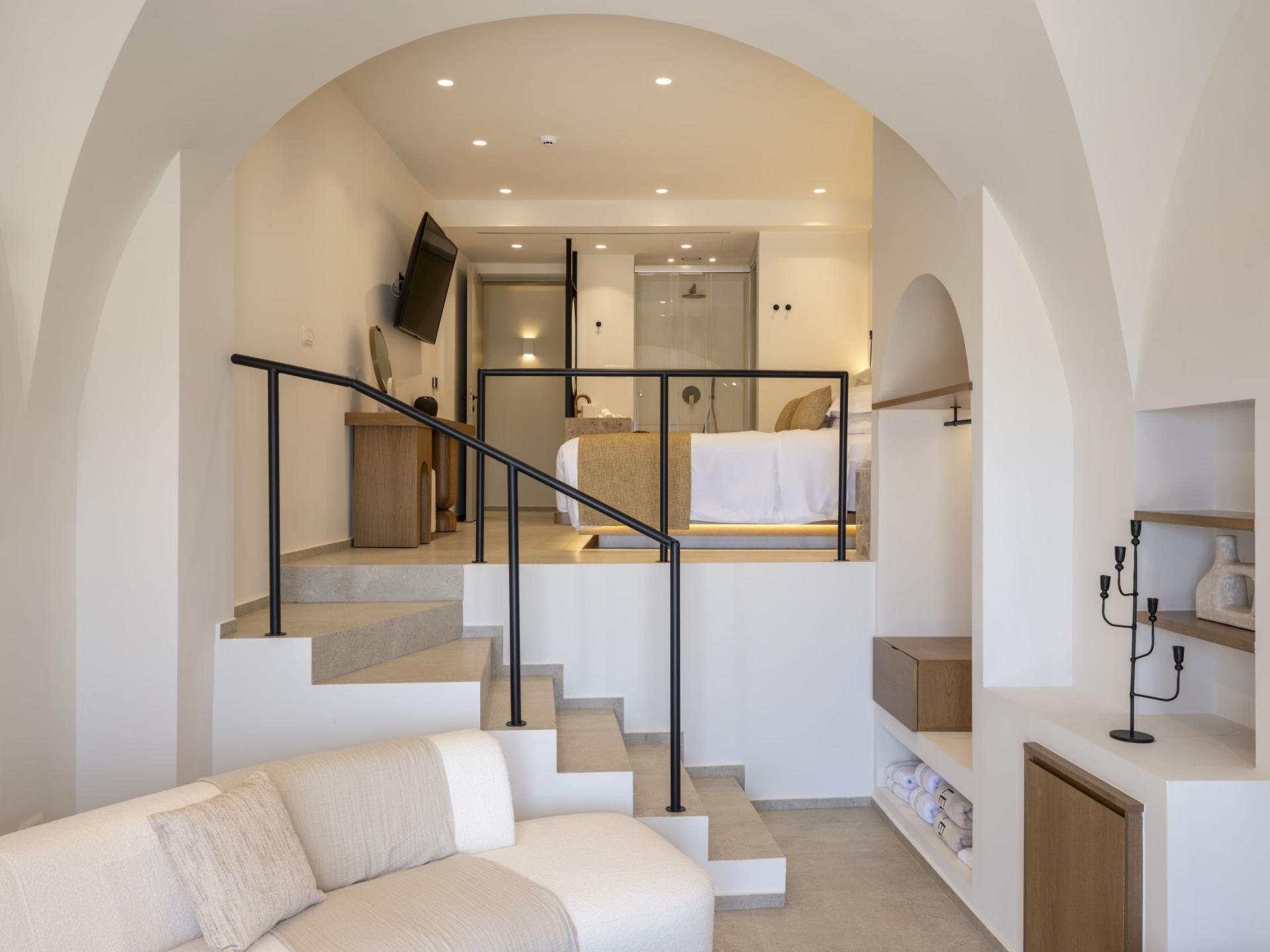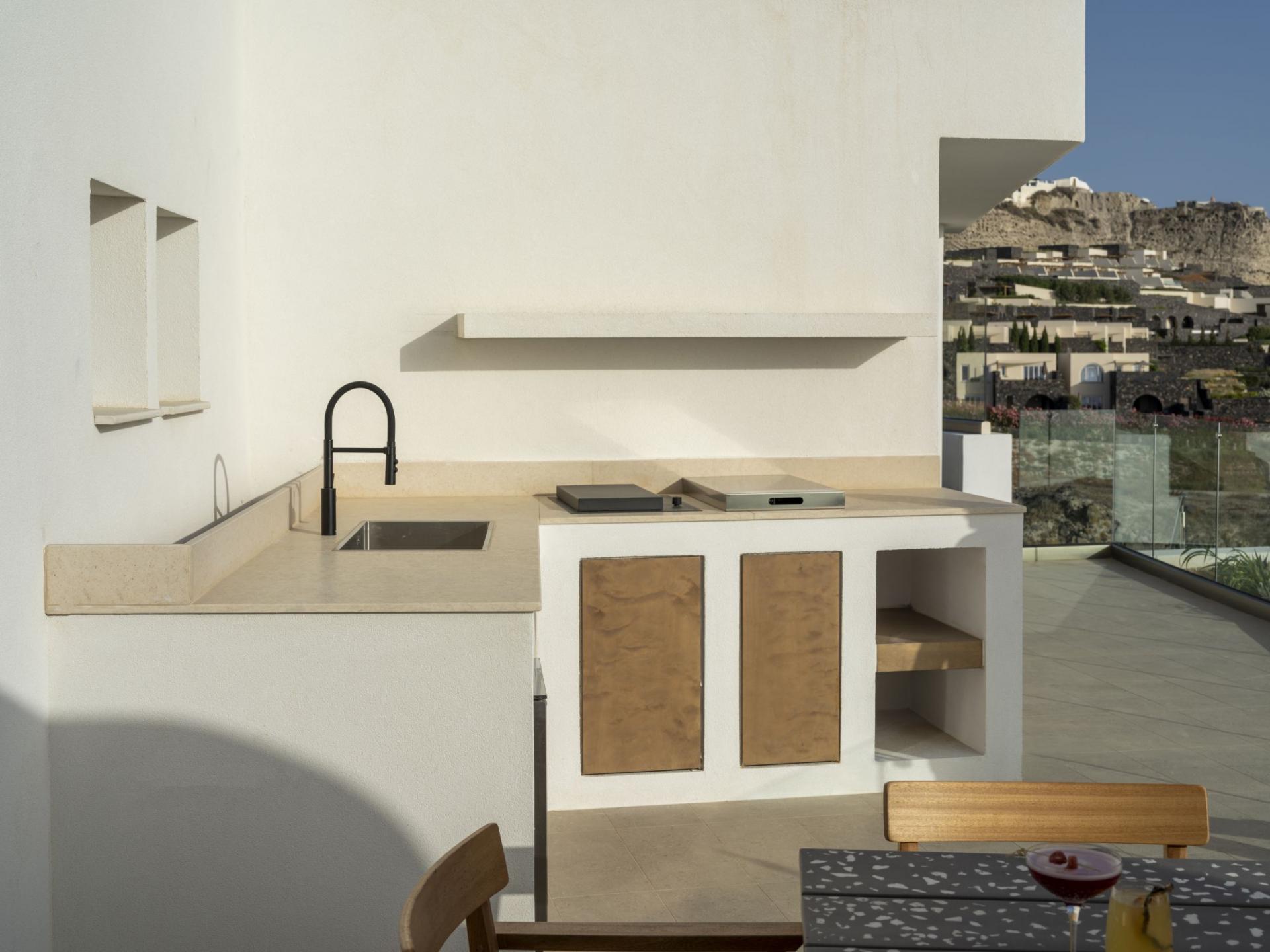 Upon entering Villa Icon, guests are welcomed into a bright, open space filled with light, thanks to its airy interiors inspired by traditional Greek architecture. Split between three levels, the whole property is a masterpiece of Cycladic elegance and modern luxury design. Enjoy a break from the sun in the stylish seating area, where a white sofa creates the perfect atmosphere where to relax. Inside, the property also features a fully-equipped kitchen with a dining counter, perfect for preparing quick meals.
