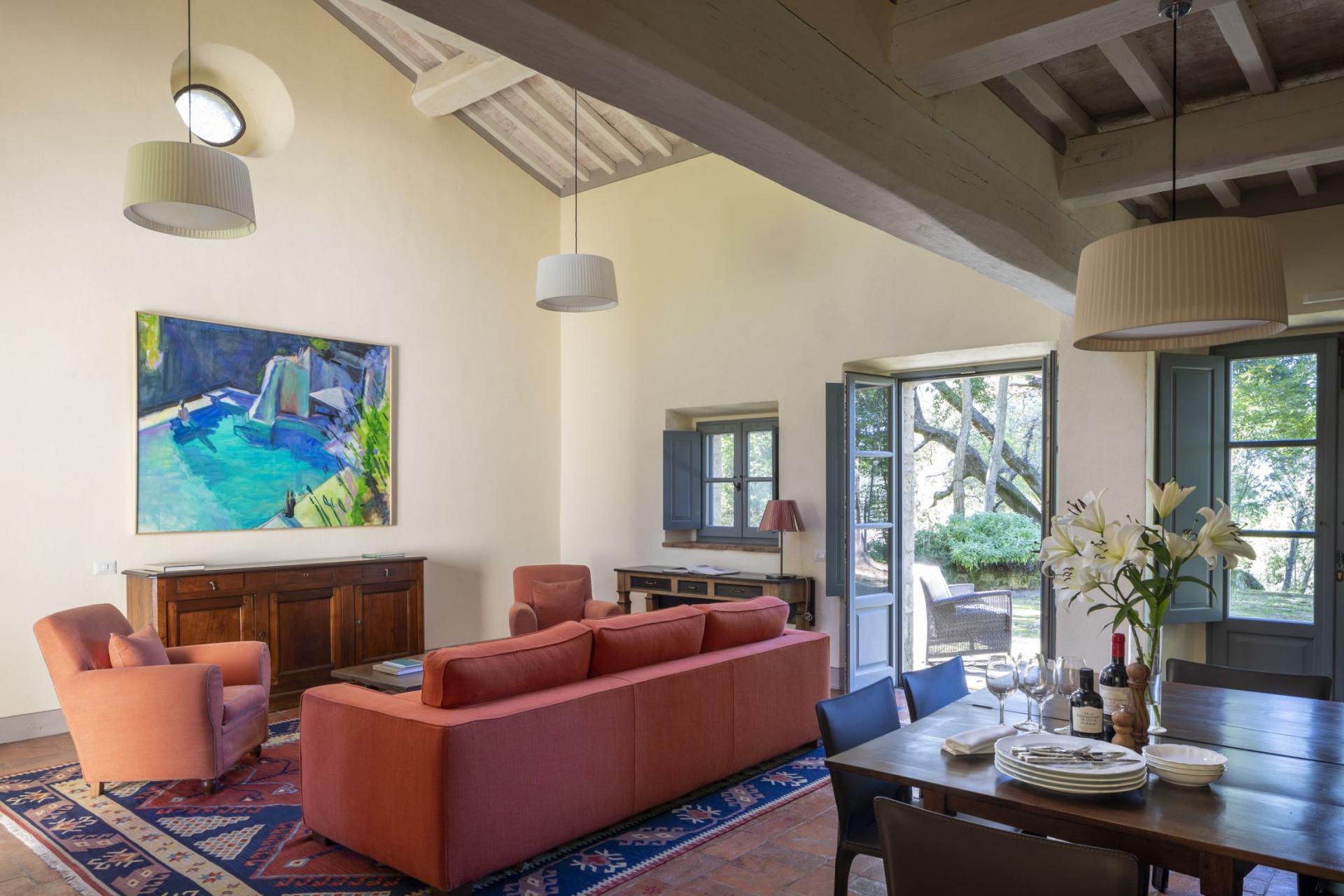 The Artist's House's interiors are characterised by a spacious ground floor, designed to inspire creativity and relaxation. Here, large windows flood the space with natural light, creating a perfect setting for relaxing and socialising together on the comfortable sofas, after a day of exploring the Borgo Pignano estate. With high beamed ceilings, large glass skylight and terracotta floors, as well as the unique wood-burning fireplace, the property oozes traditional style. Nearby, a country style kitchen and indoor dining area will have everything you need to prepare and enjoy homemade dishes. The owner's of the estate are art enthusiasts, and this villa is a nod to their passion, with displays of characterful pieces with inspiration from the estate, found throughout.